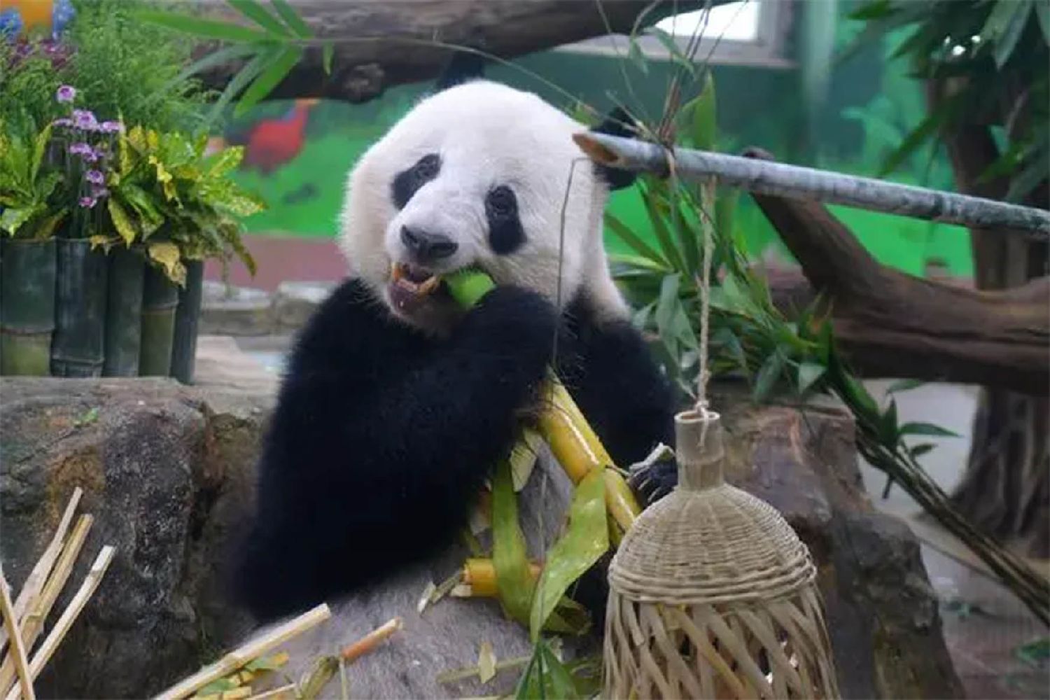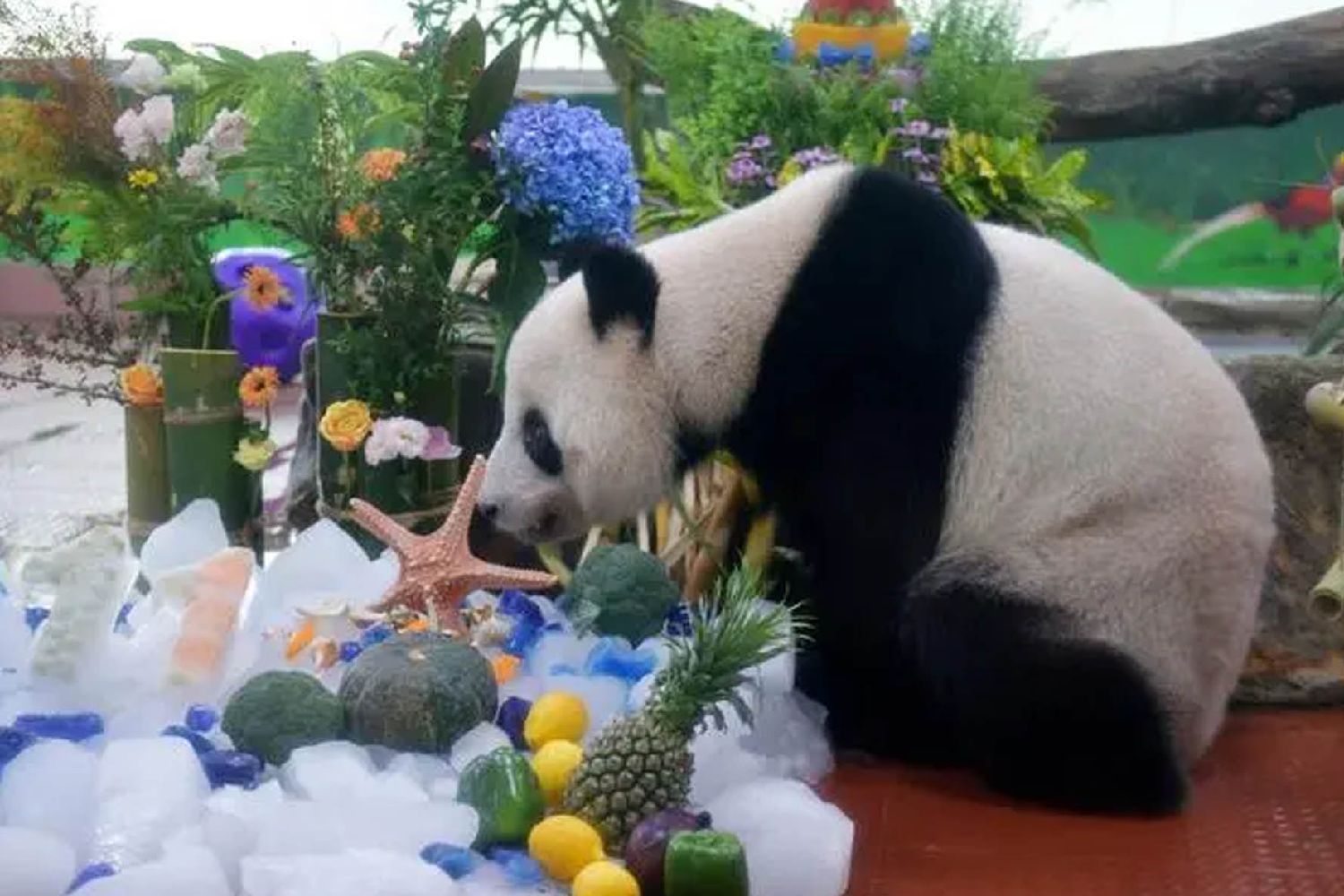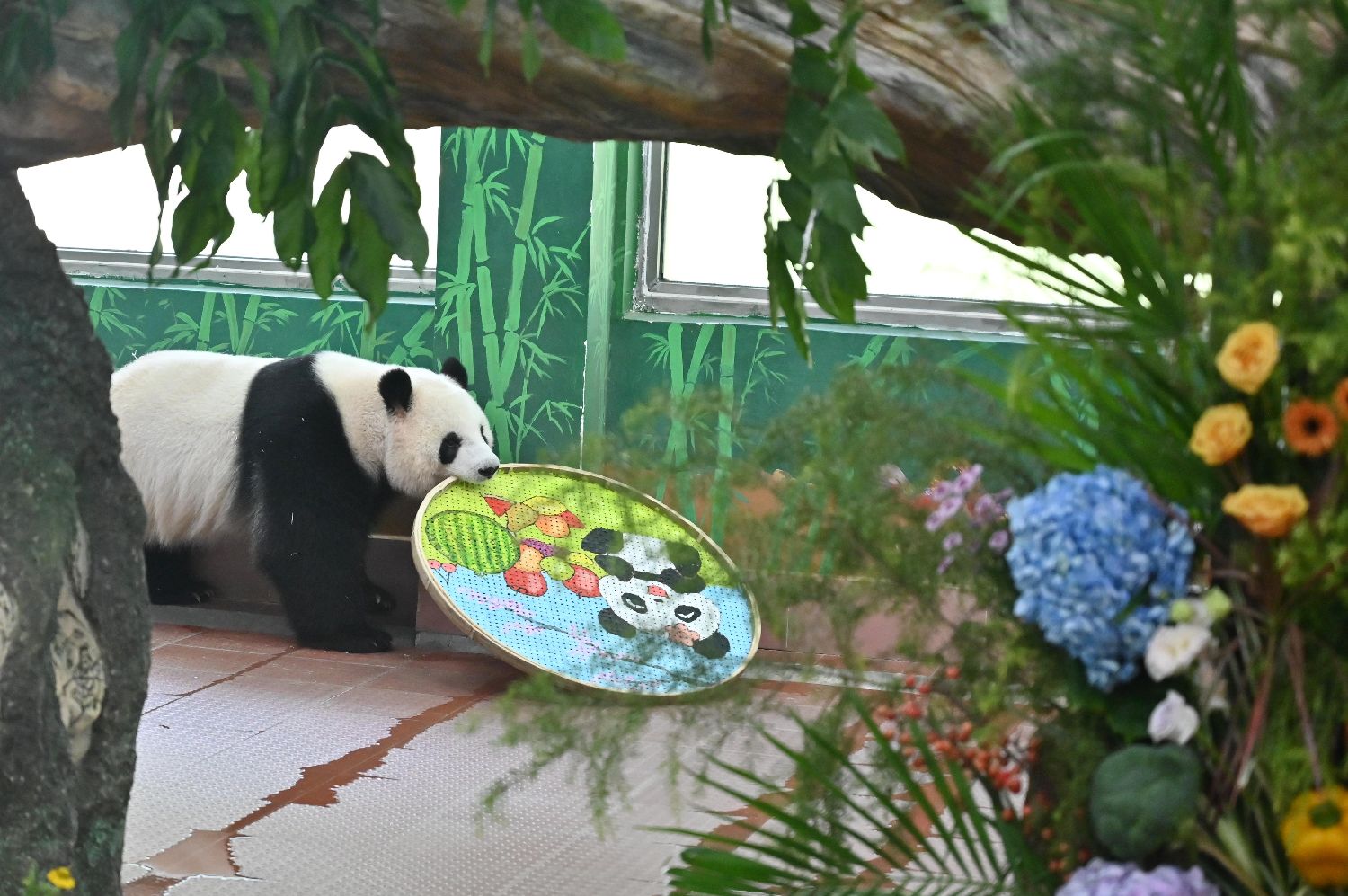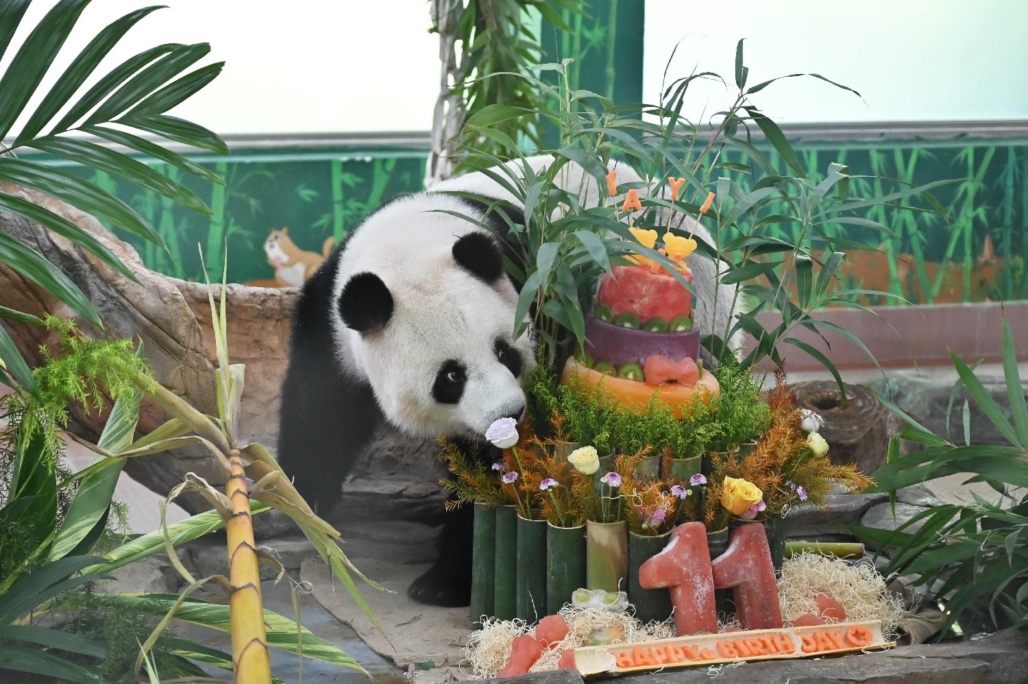“雅一”则收到一面缤纷浪漫的水果花墙。由各色花卉和西瓜、苹果等多种蔬菜水果组成的生日花墙,寓意“五谷丰登”,场馆上方悬挂着画有“雅一”的竹筛,仪式感满满。图为8月27日,大熊猫“雅一”准备享用生日餐。(图片来源:中新社)