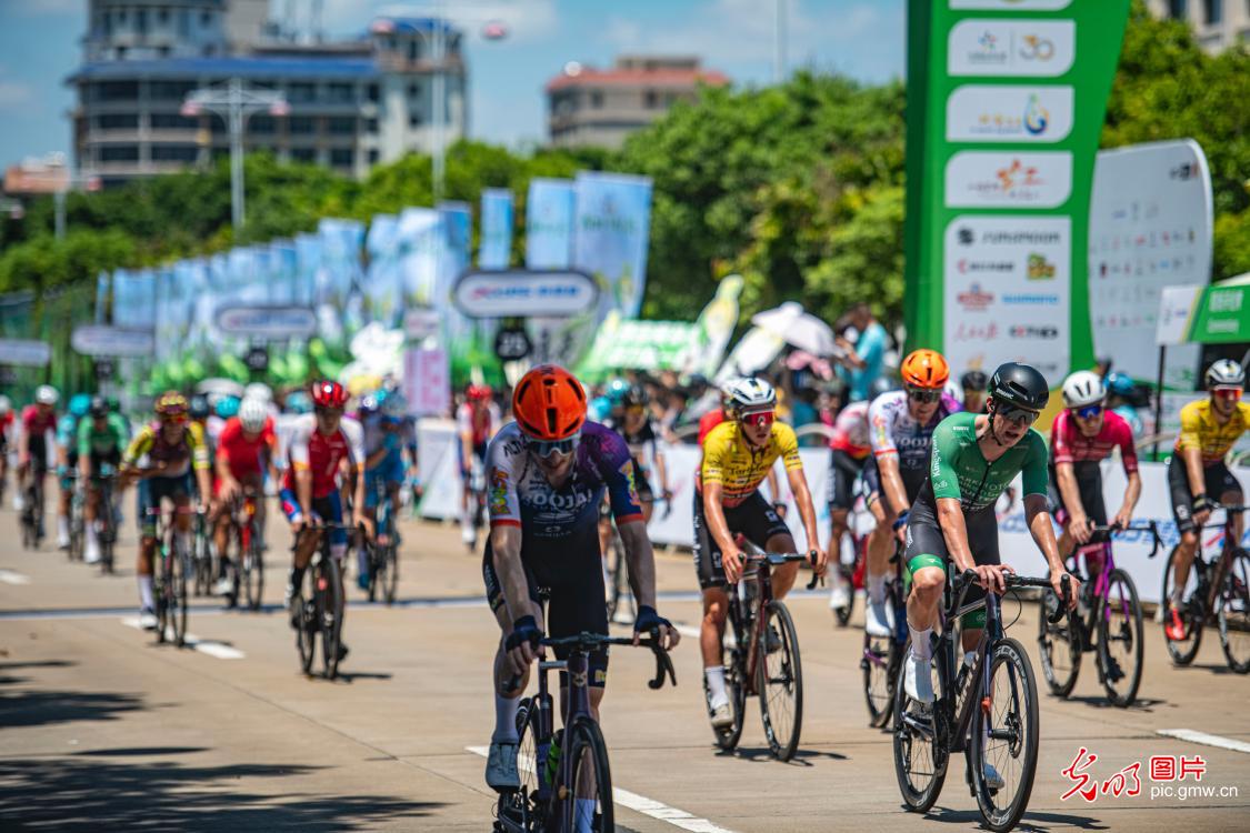 车手在琼海进行绕圈赛,途经潭门千年渔港、中国(海南)南海博物馆、博鳌论坛会址等景点,赛程95.6公里。(图片来源:北京光明网)