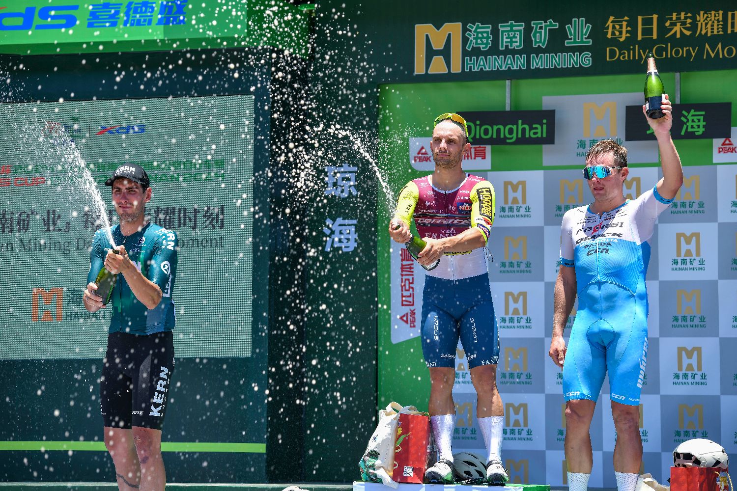8月27日,2024第十五届环海南岛国际公路自行车赛在海南琼海开赛。来自海内外的20支车队138名车手参赛,赛事总奖金30万美元。当日进行的第一赛段(琼海-琼海)比赛全程95.6千米,最终意大利克罗蒂克车队选手雅各布·马雷茨科(中)获赛段冠军,西班牙科恩制药车队选手费尔南德斯·米格尔·安吉尔(左)获赛段亚军,蒙古飞跃快客洲际车队选手拉斯·马丁获赛段季军。图为获得赛段前三名选手喷洒香槟庆祝。(图片来源:中新社)