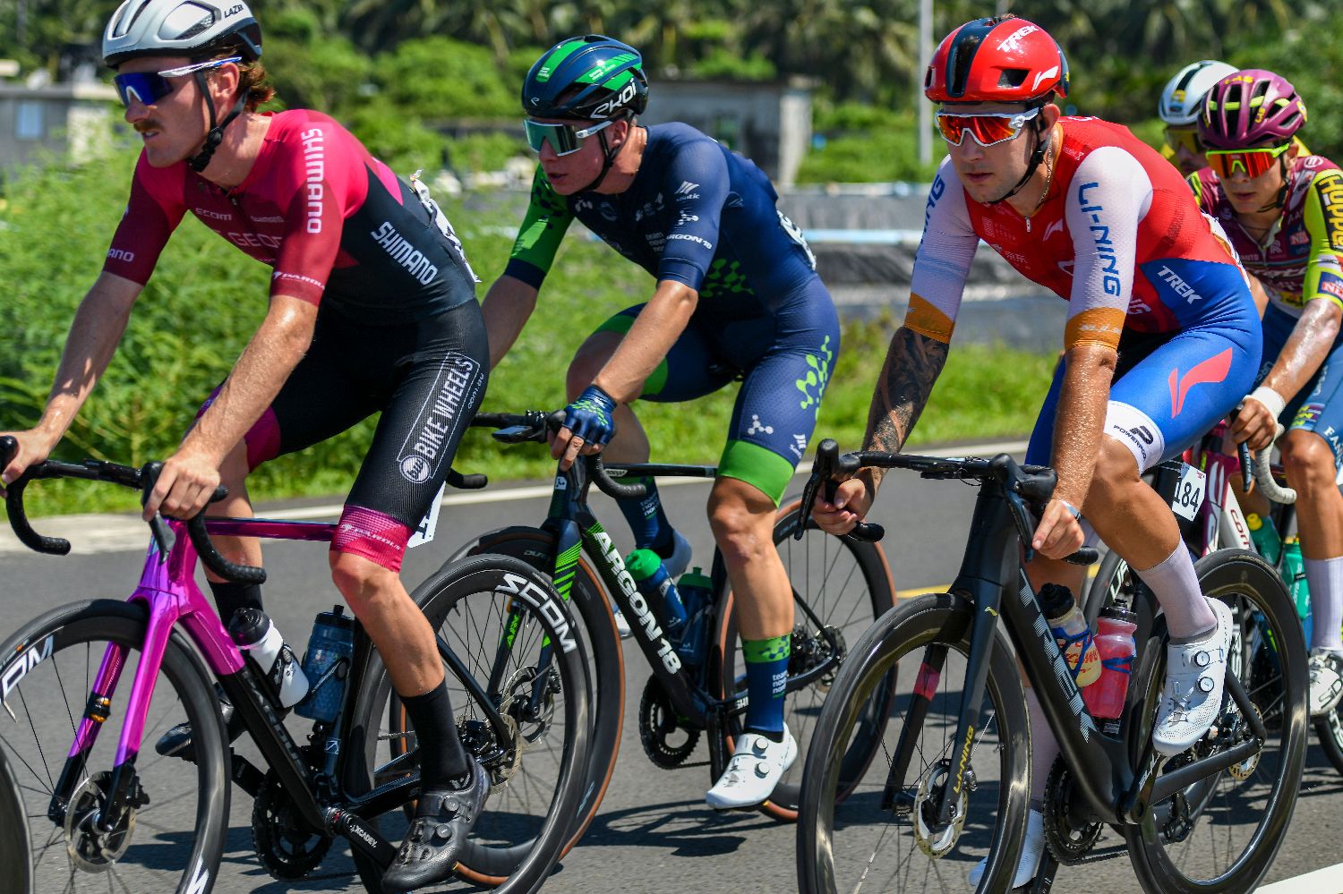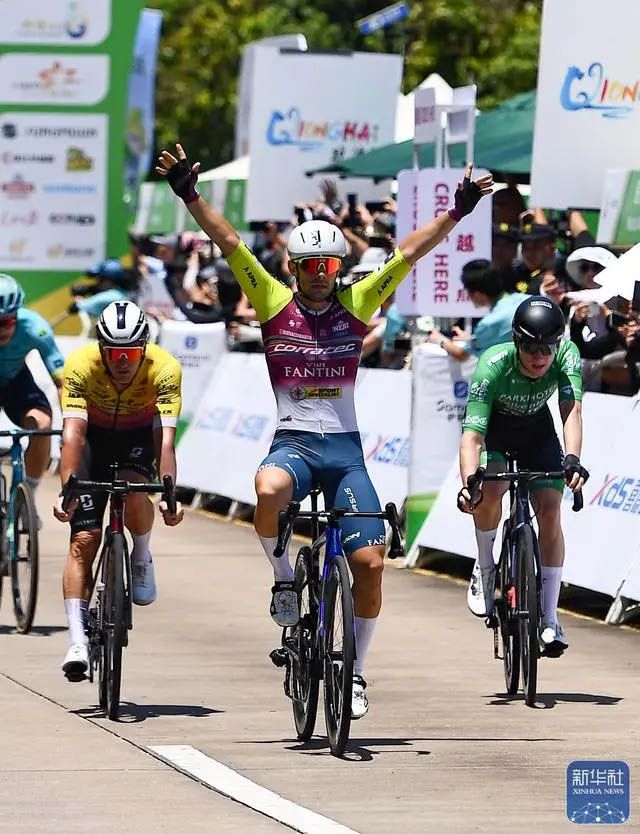 在首日琼海-琼海赛段的比赛中,意大利克罗蒂克车队选手雅各布·马雷奇科(前)获得本赛段冠军。(图片来源:新华社)