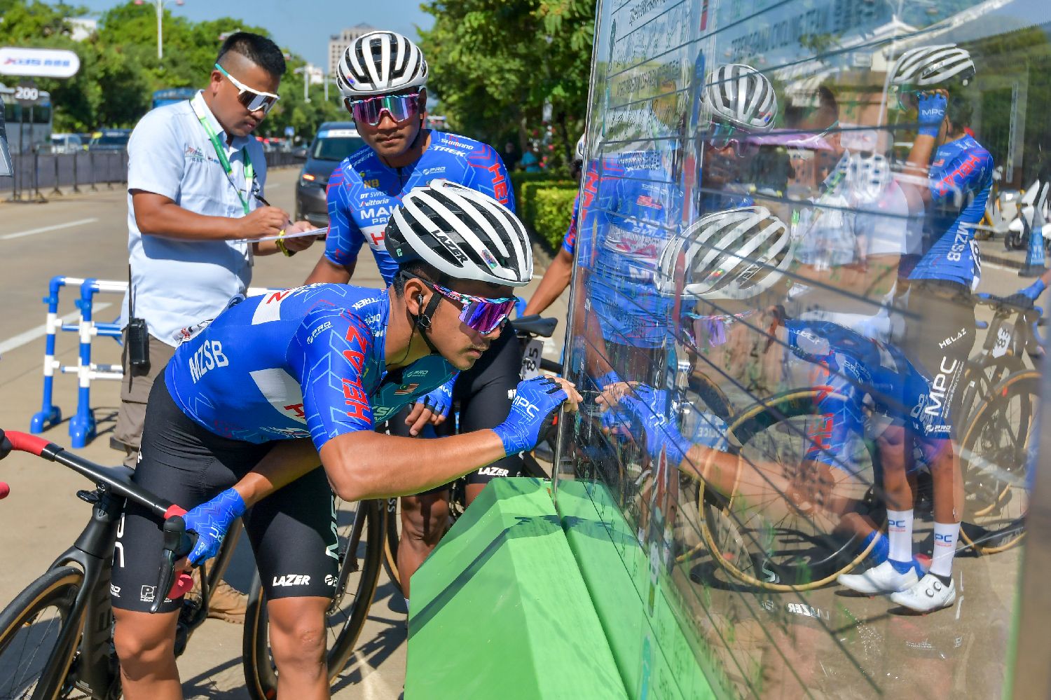 马来西亚洲际车队的车手在签到板上签到。(图片来源:中新社)