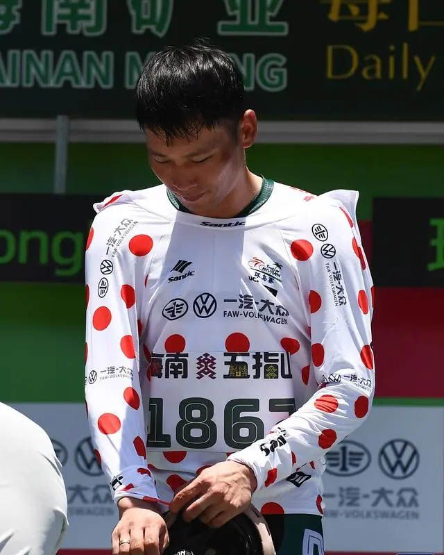 五指山1867车队车手薛超华获得代表爬坡总积分第一名的圆点衫。(图片来源:新华社)