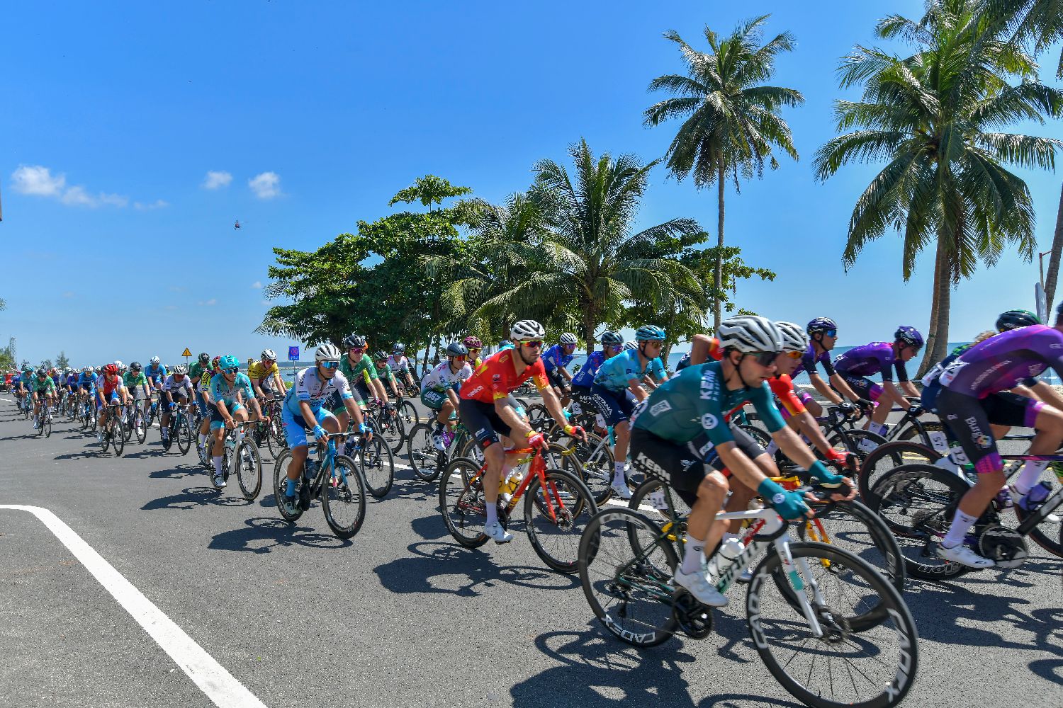 8月27日,2024第十五届环海南岛国际公路自行车赛在海南琼海开赛。当日进行的第一赛段(琼海-琼海)比赛全程95.6千米。图为选手在比赛中。(图片来源:中新社)