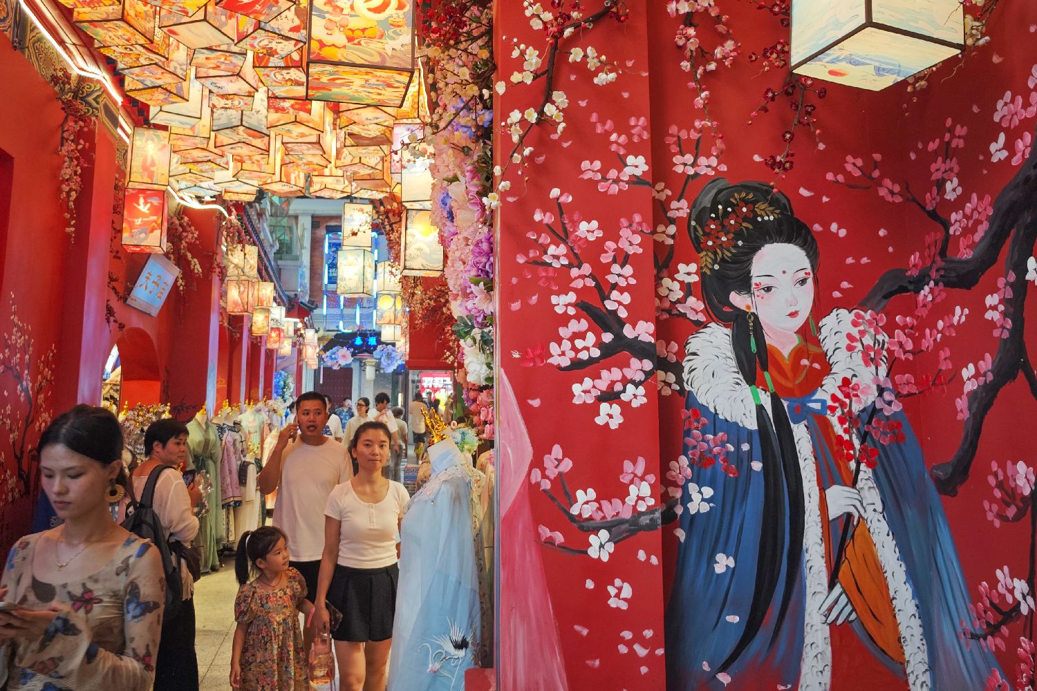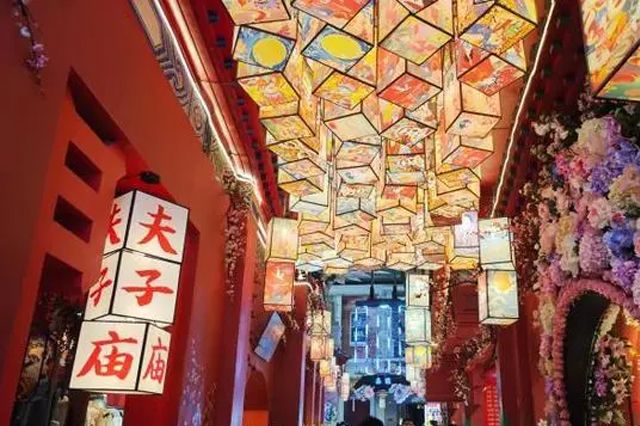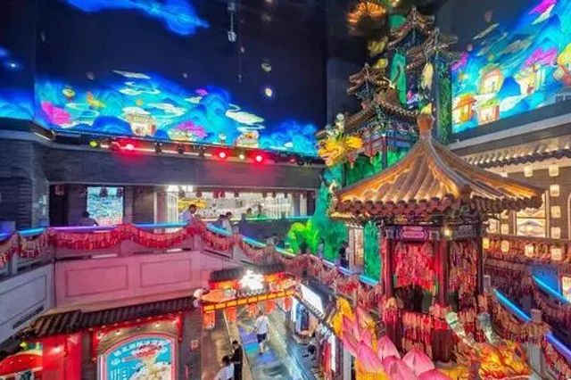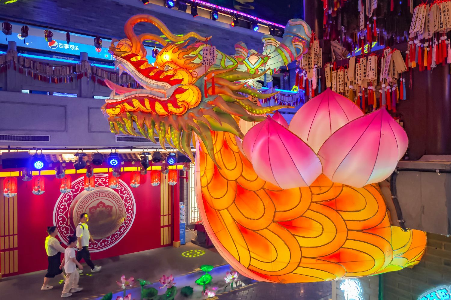 在江苏南京,游客1日在城南秦淮·戏院里参观古风市集、上元灯会,体验“人在戏中游”沉浸氛围。