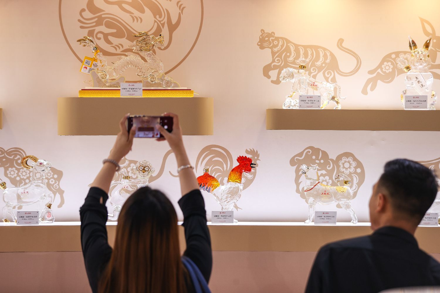 酒博会9日展出的十二生肖酒瓶吸引参观者。(图片来源:中新社)