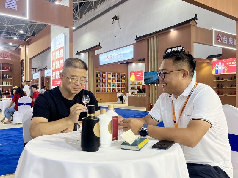 参展商9日在酒博会现场洽谈业务。(图片来源:新华社)