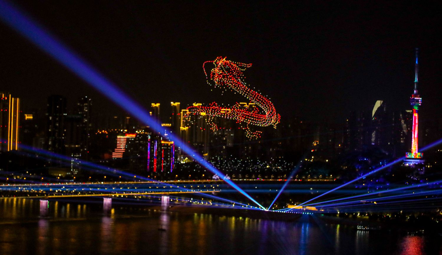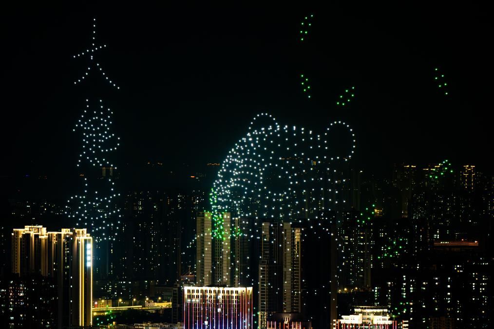 数千架无人机在空中迅速变换阵型,展现长江流域的标志性地标,包括湖北的三峡大坝、重庆的洪崖洞等。图为无人机组成的一条巨龙在天空“腾飞”。(图片来源:中新社)