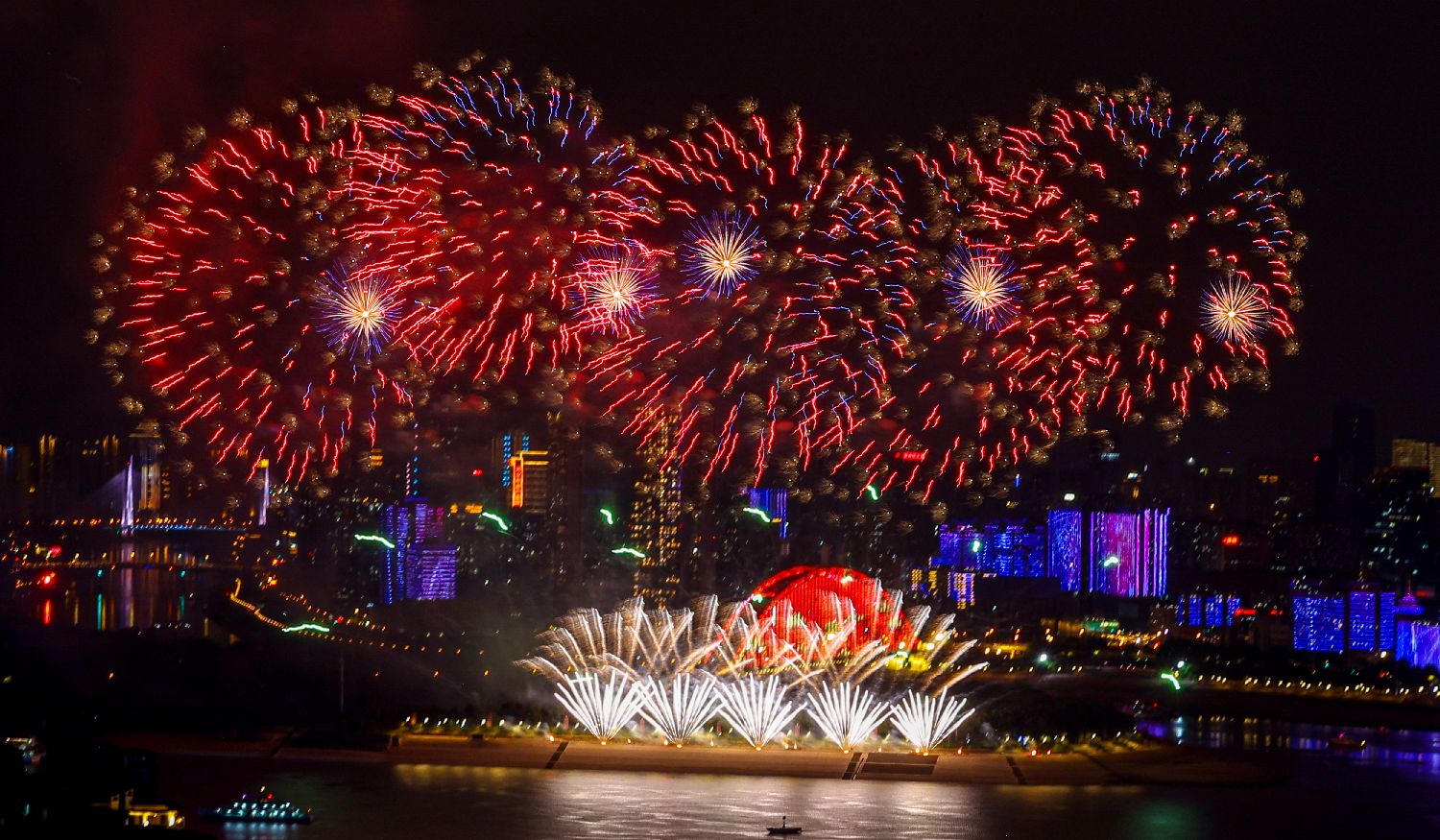 长江文化艺术季将持续2个月时间,期间还将举办主题美术作品展、电影周、舞台艺术精品展、合唱周、阅读周、文学周、非遗展等。图为大型烟花映照夜空。(图片来源:中新社)