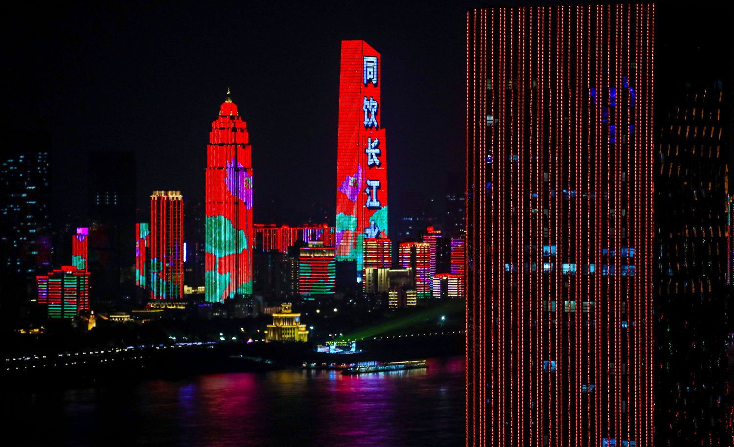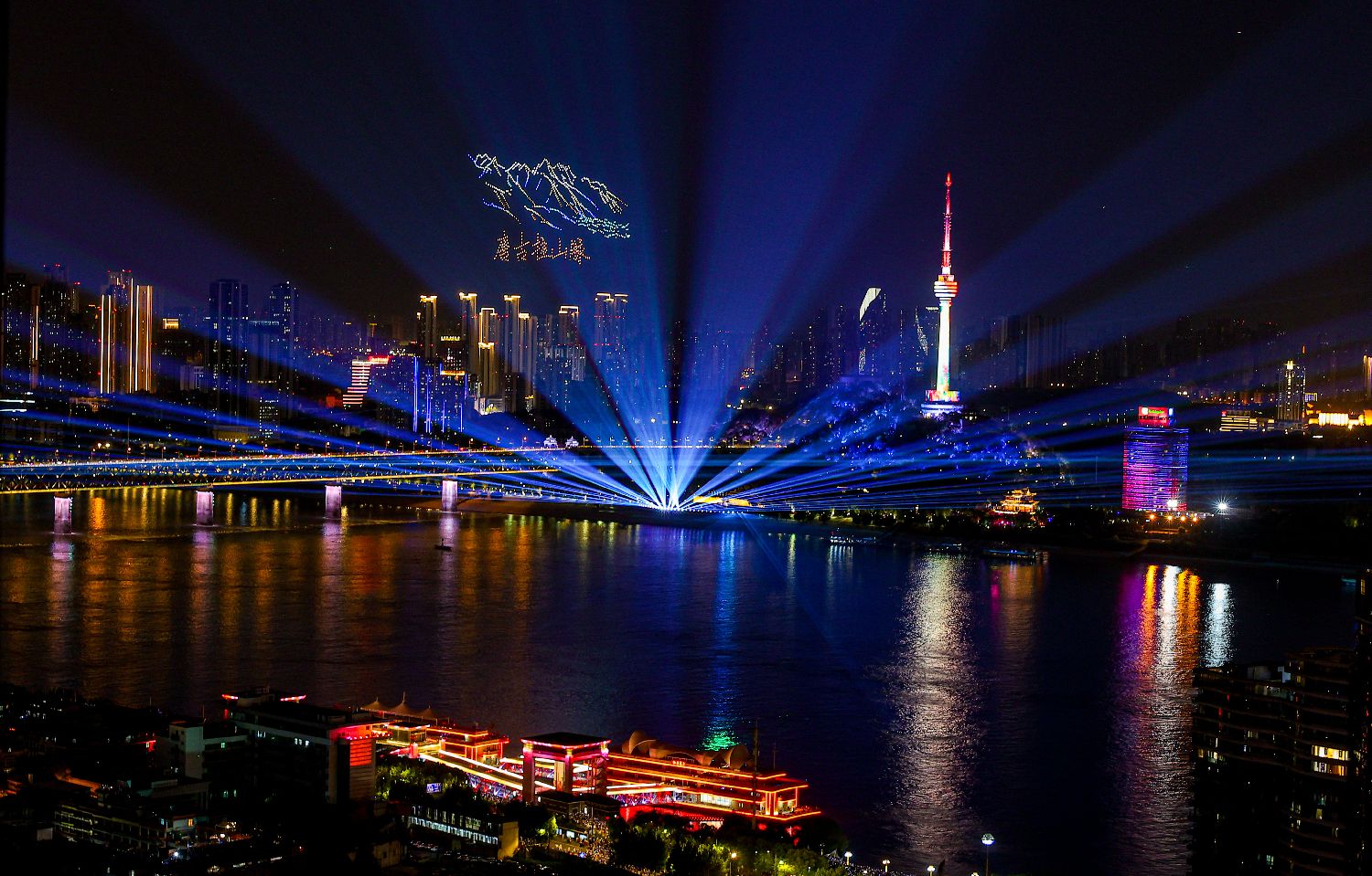 开幕式以长江为舞台,通过“名家话长江”“百姓贺佳节”“万里迎宾朋”“长江光影秀”四个篇章,在水上、岸边、空中,轮番献上大合唱、主题光影秀、烟火秀、无人机表演等活动。图为表演现场。(图片来源:新华社)