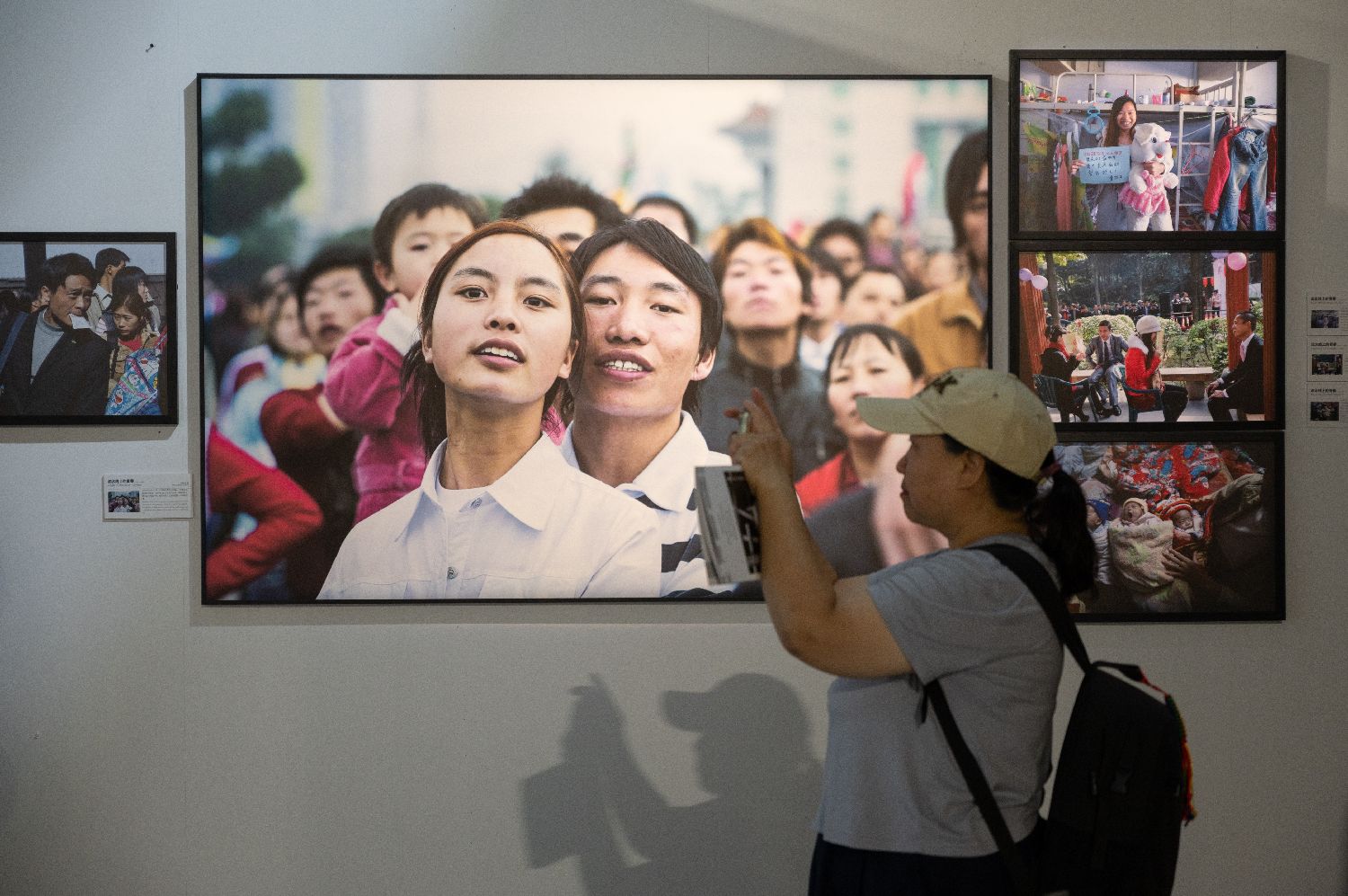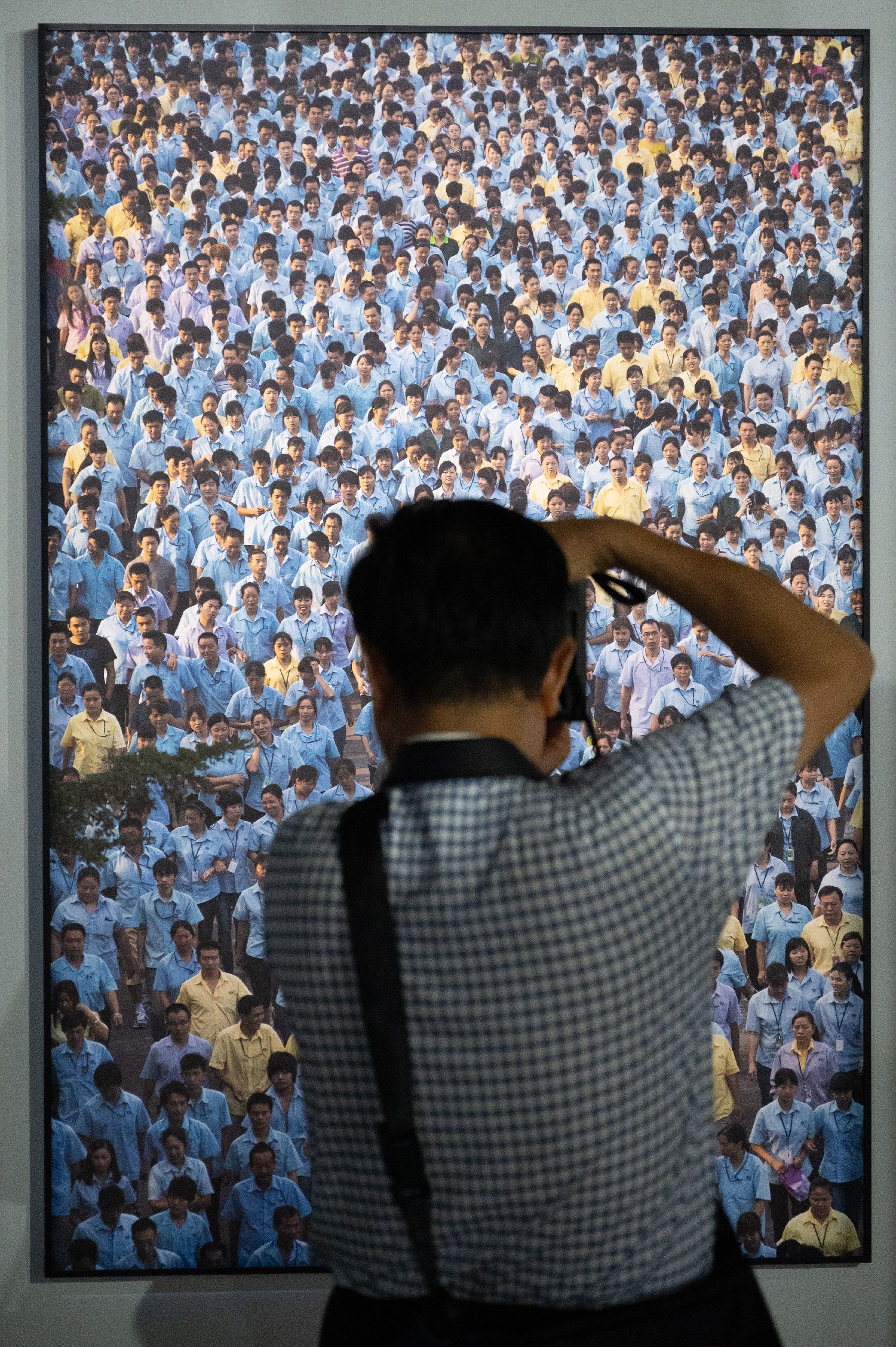 观众19日参观平遥国际摄影大展上的摄影作品《流水线上的青春》。(图片来源:中新社)