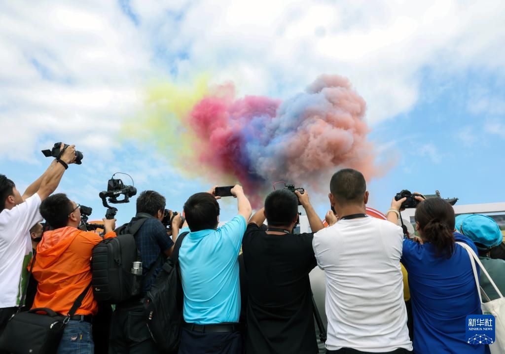 中外摄影人在开幕式上拍摄彩色烟花造型。(图片来源:新华社)