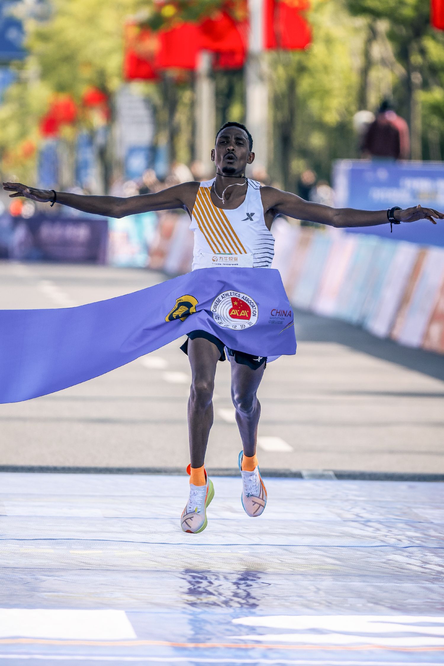 埃塞俄比亚选手得撒乐根·吉玛·得布乐(DesalegnGirmaDebel)以2小时08分30秒的成绩获得男子全程冠军,打破尘封12年的太马赛会纪录,将赛会纪录提高21秒。(图片来源:中新社发太原马拉松组委会供图)