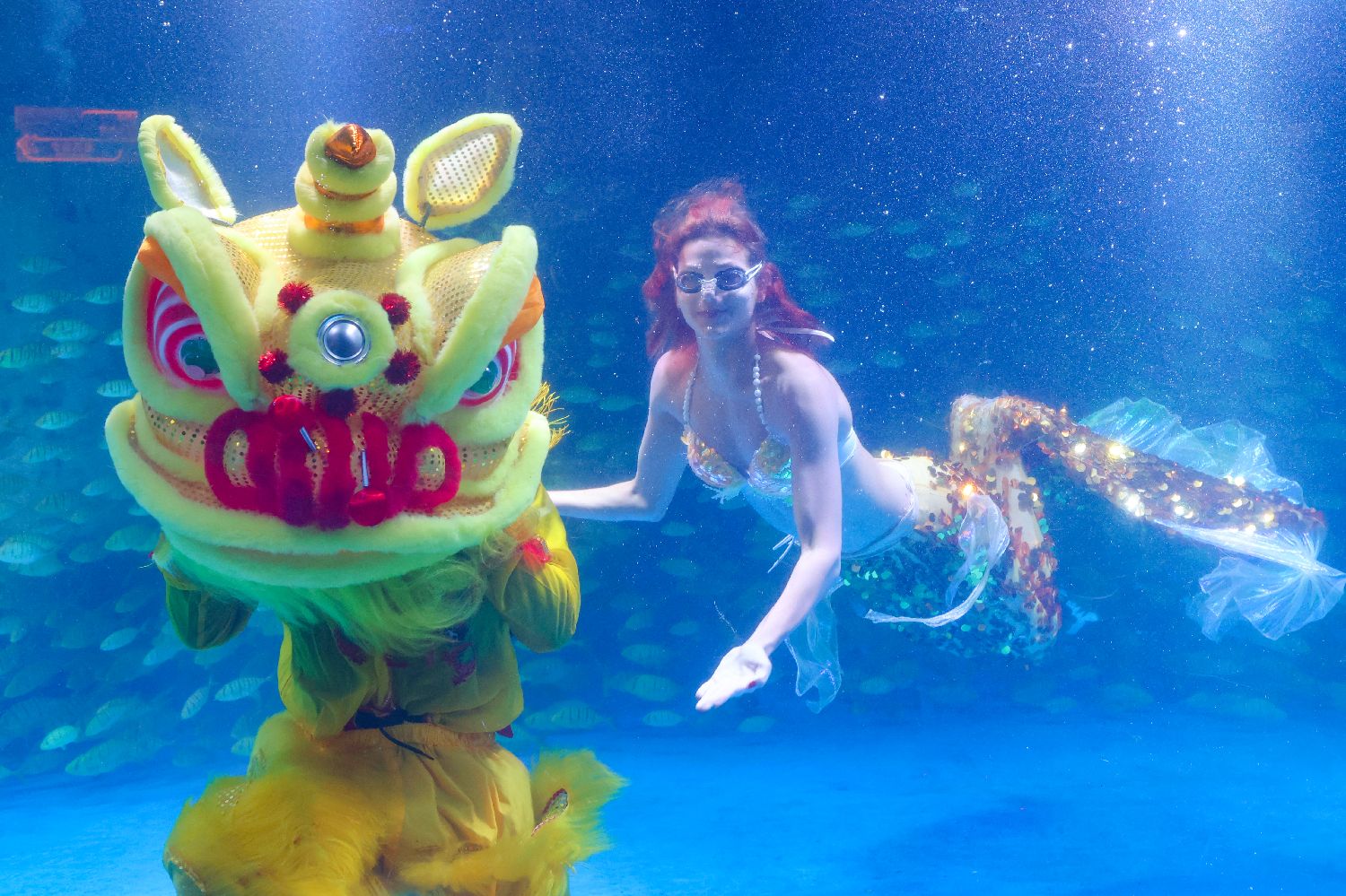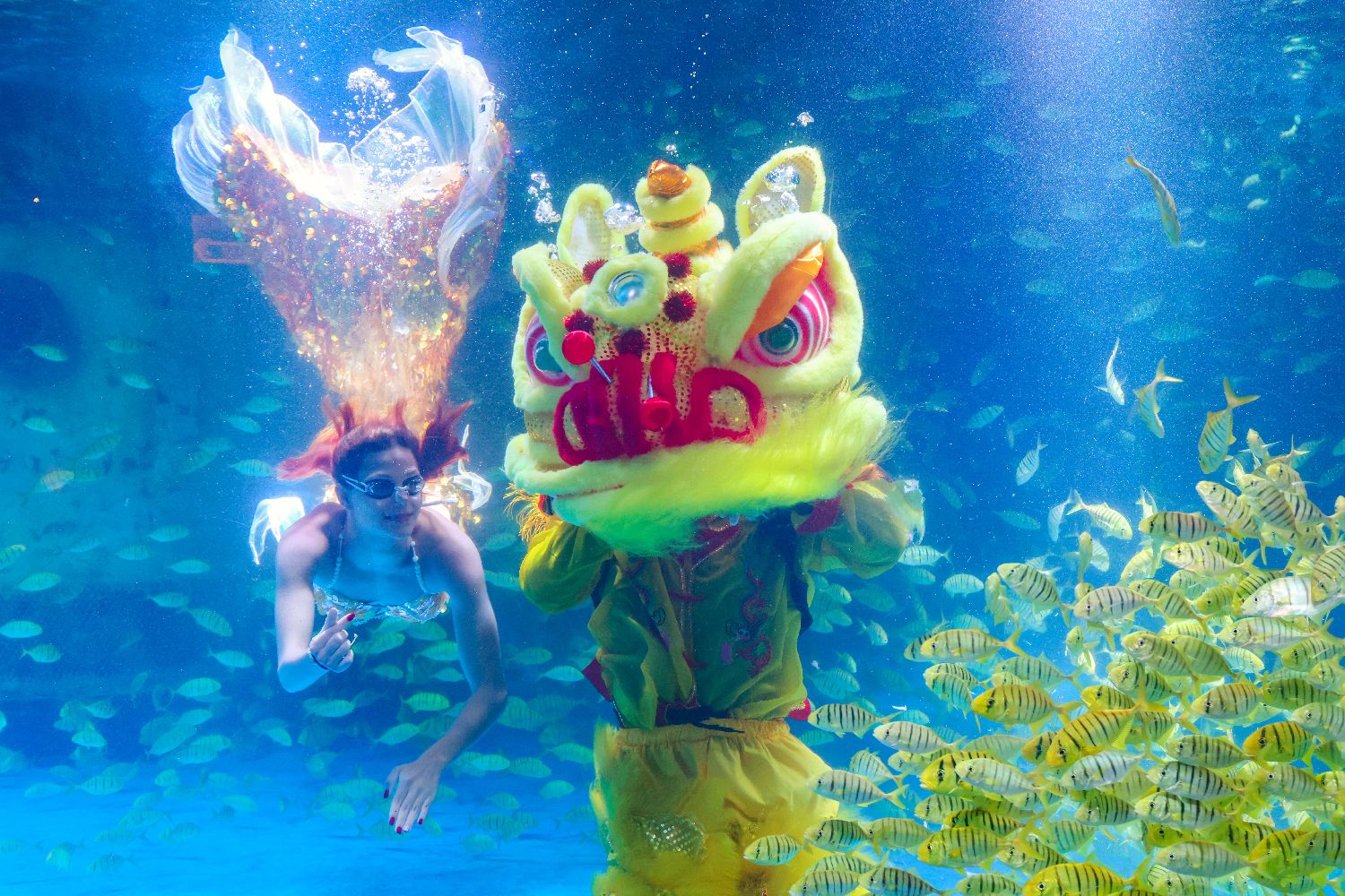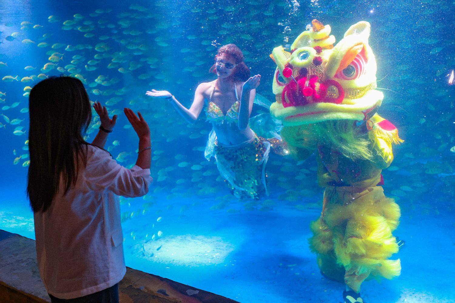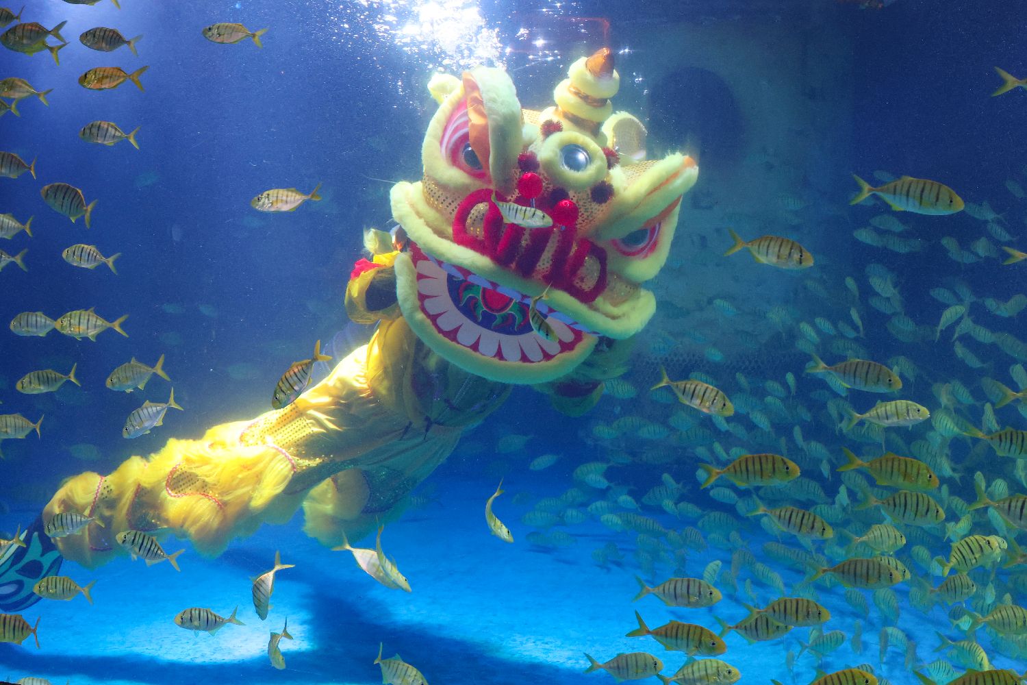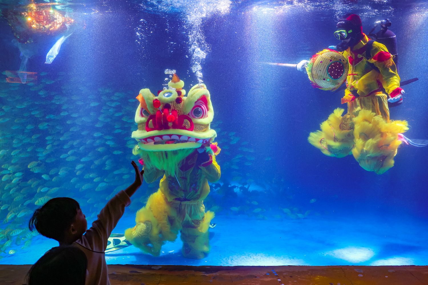在江苏南京,海底世界潜水员24日携带传统舞狮装备跃入水中,在鱼群的环绕下漫游起舞,上演“水下醒狮”特别节目,让人耳目一新。