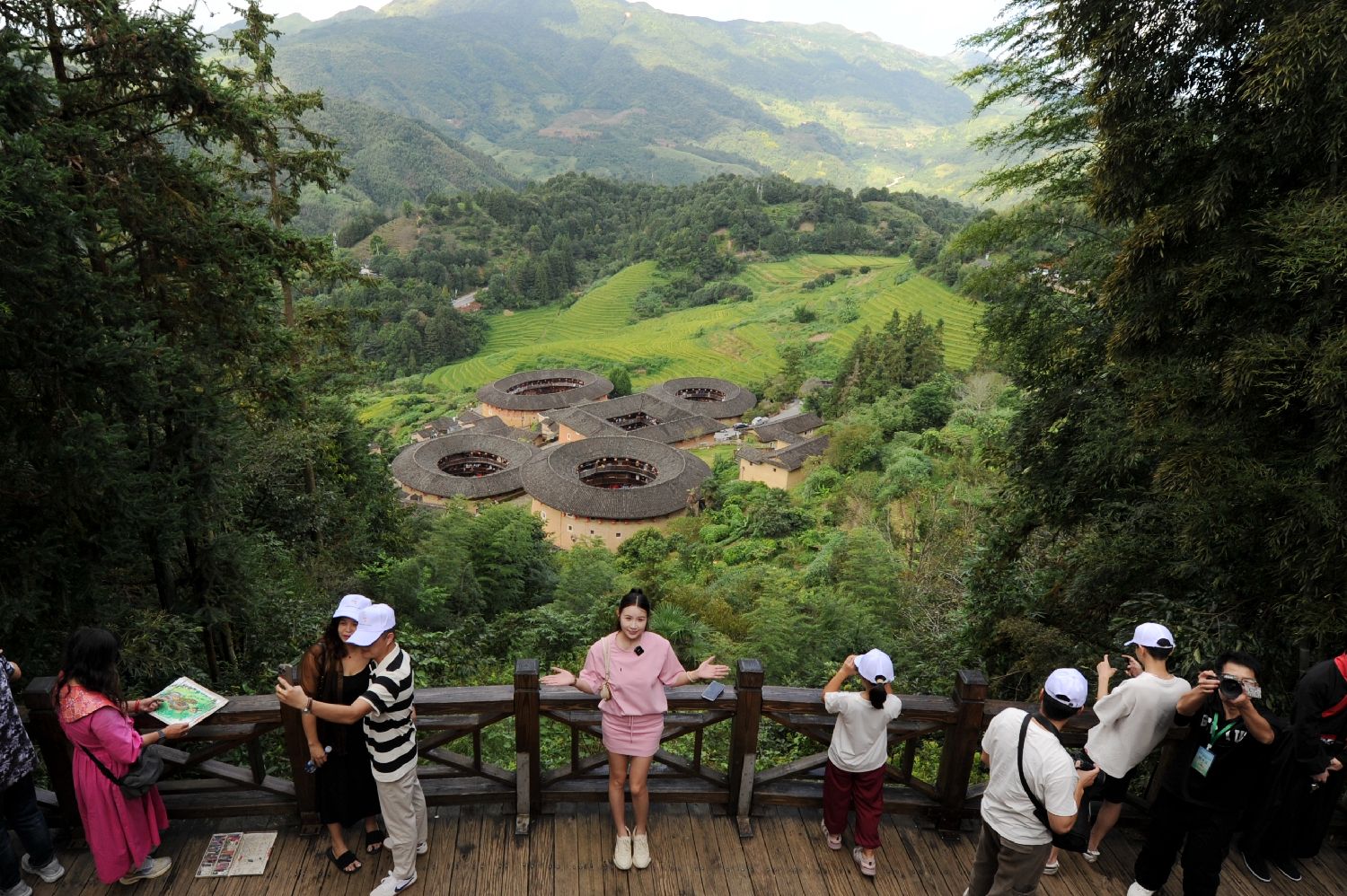 9月26日,福建南靖,田螺坑土楼群吸引不少游客参观、拍照。