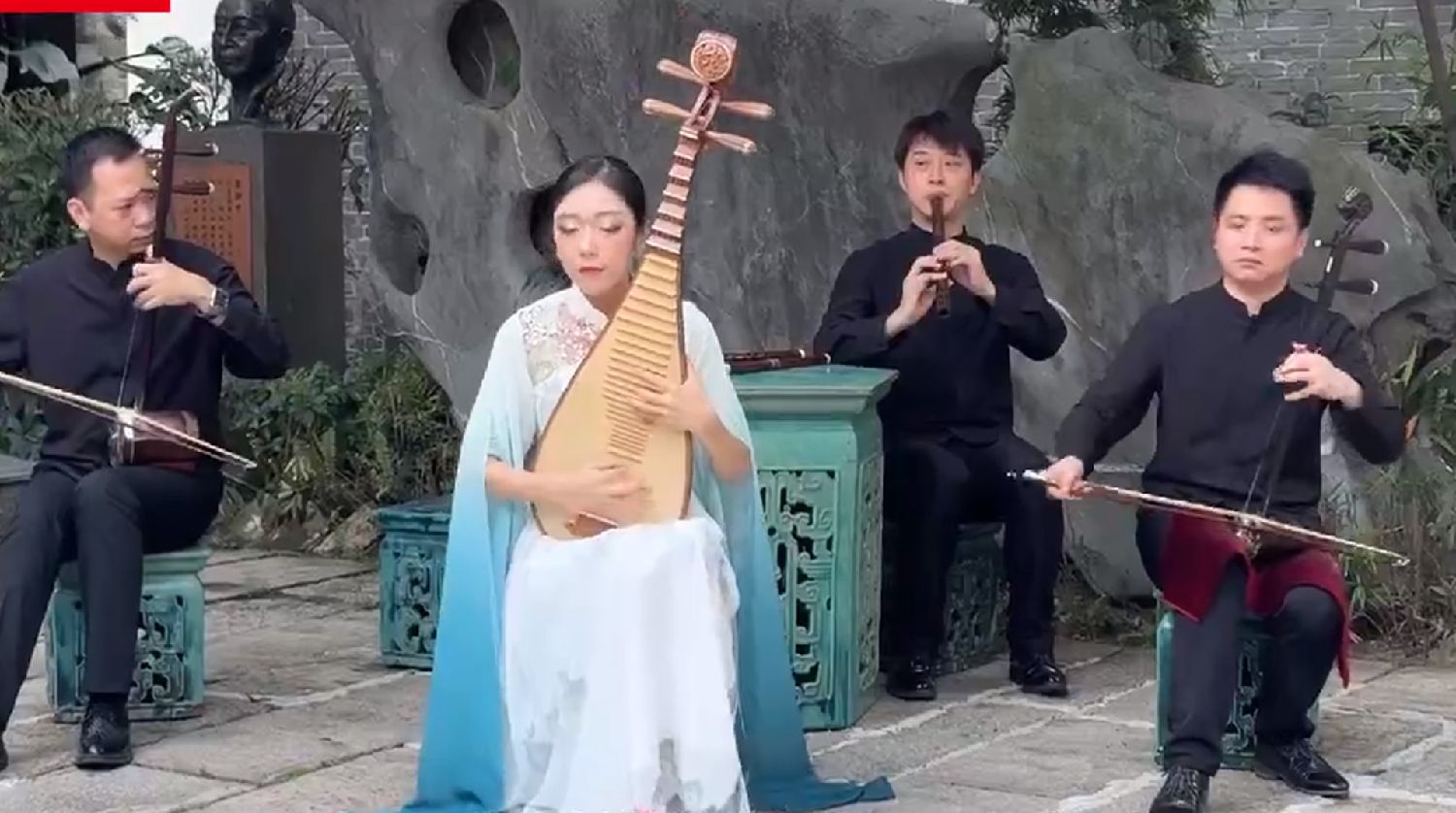 经高标准选址、高质量规划建设,十香园已焕新为集文化讲堂、时尚阅读空间、艺术展区等于一体的新型公共文化空间。图为曲艺团在十香园内演奏。(图片来源:《广州日报》视频截图)