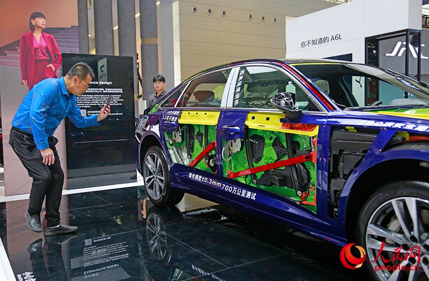 一汽红旗、东风风神、上汽荣威、长安汽车、北京汽车、广汽传祺、比亚迪、奇瑞、吉利汽车等均亮相展会现场。图为一名外国男子乘坐体验。(图片来源:北京人民网)