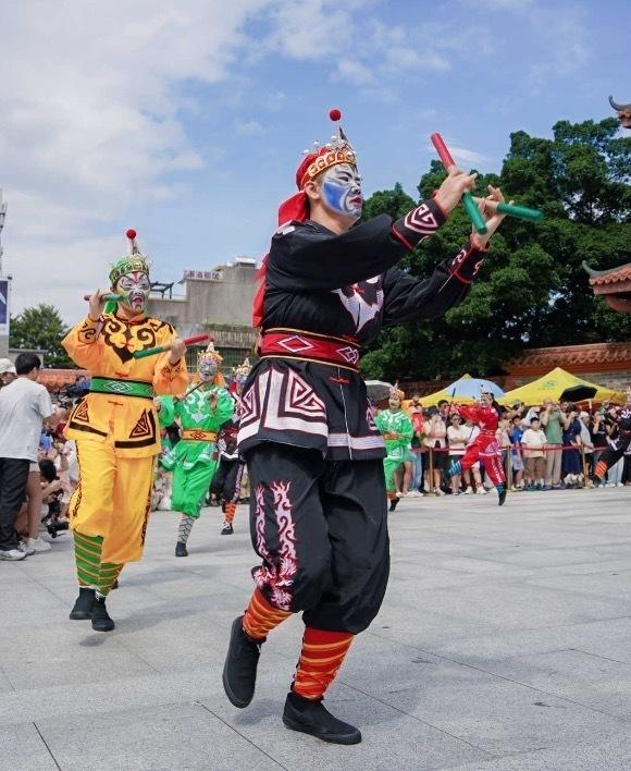 游客们在镇海楼广场欣赏了英歌舞与龙狮表演。(图片来源:《广州日报》大洋网)