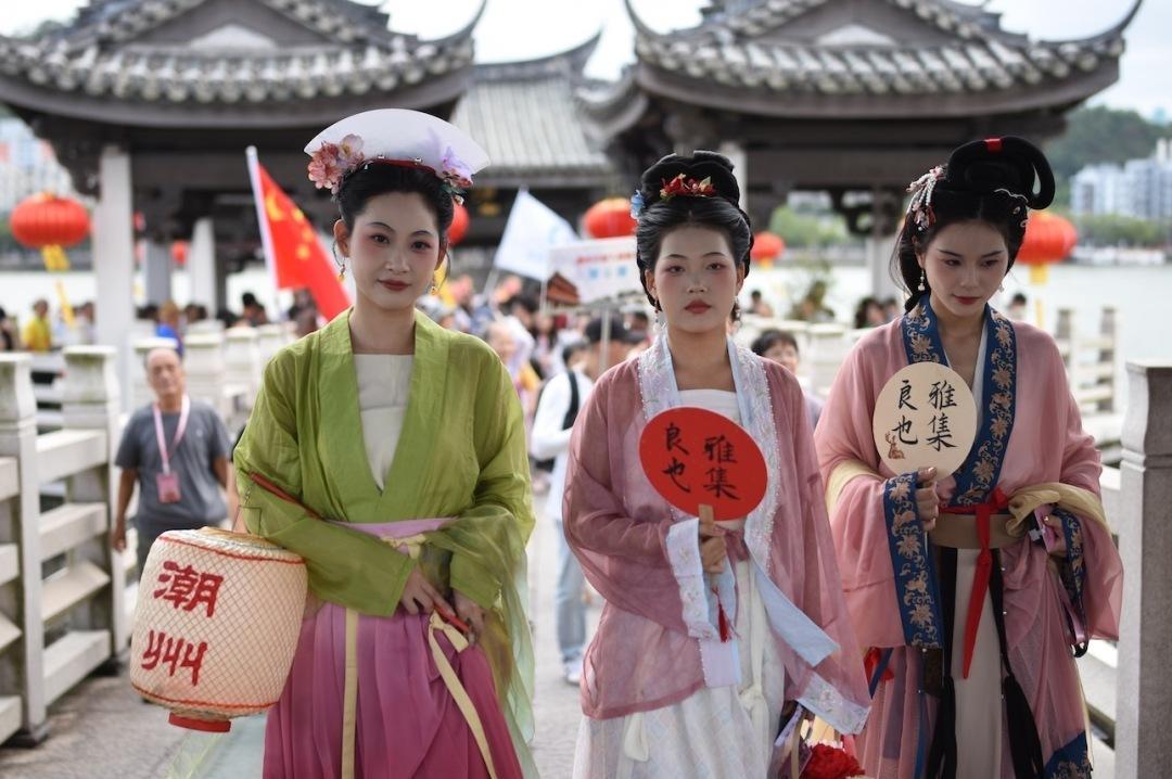 在广济桥上,游客们聆听导游的讲解,并与身着汉服的少女合影留念,感受古城的文化魅力。(图片来源:《广州日报》大洋网)