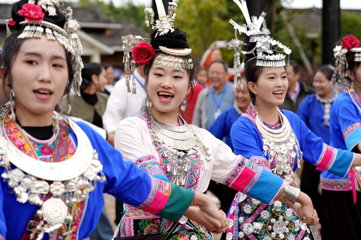 10月2日,在广西三江侗族自治县八江镇布央村,民众在茶文化艺术节中演唱侗族大歌、弹唱侗族琵琶歌、跳多耶舞、赛芦笙,以多彩民俗活动庆祝中国国庆节。图为民众在表演多耶舞。(图片来源:中新社)