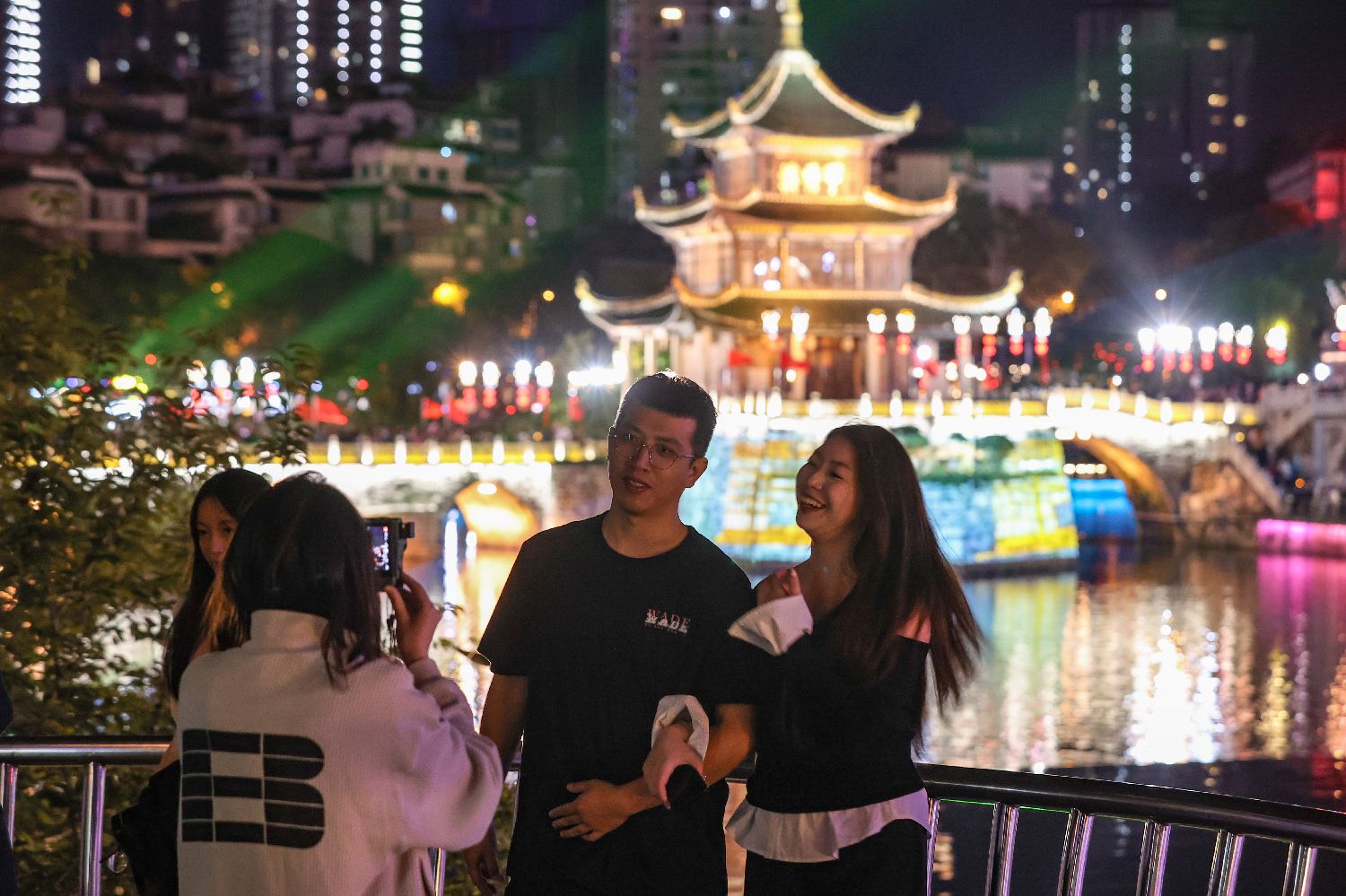 北京时间10月2日晚,贵州省贵阳市南明区甲秀楼景区、青云市集、筑城广场的夜游、夜购、夜演(路边音乐会)项目人气旺盛,吸引众多游客选择夜间出游、消费,度过中国国庆假期。图为游客在甲秀楼景区拍照。(图片来源:中新社)