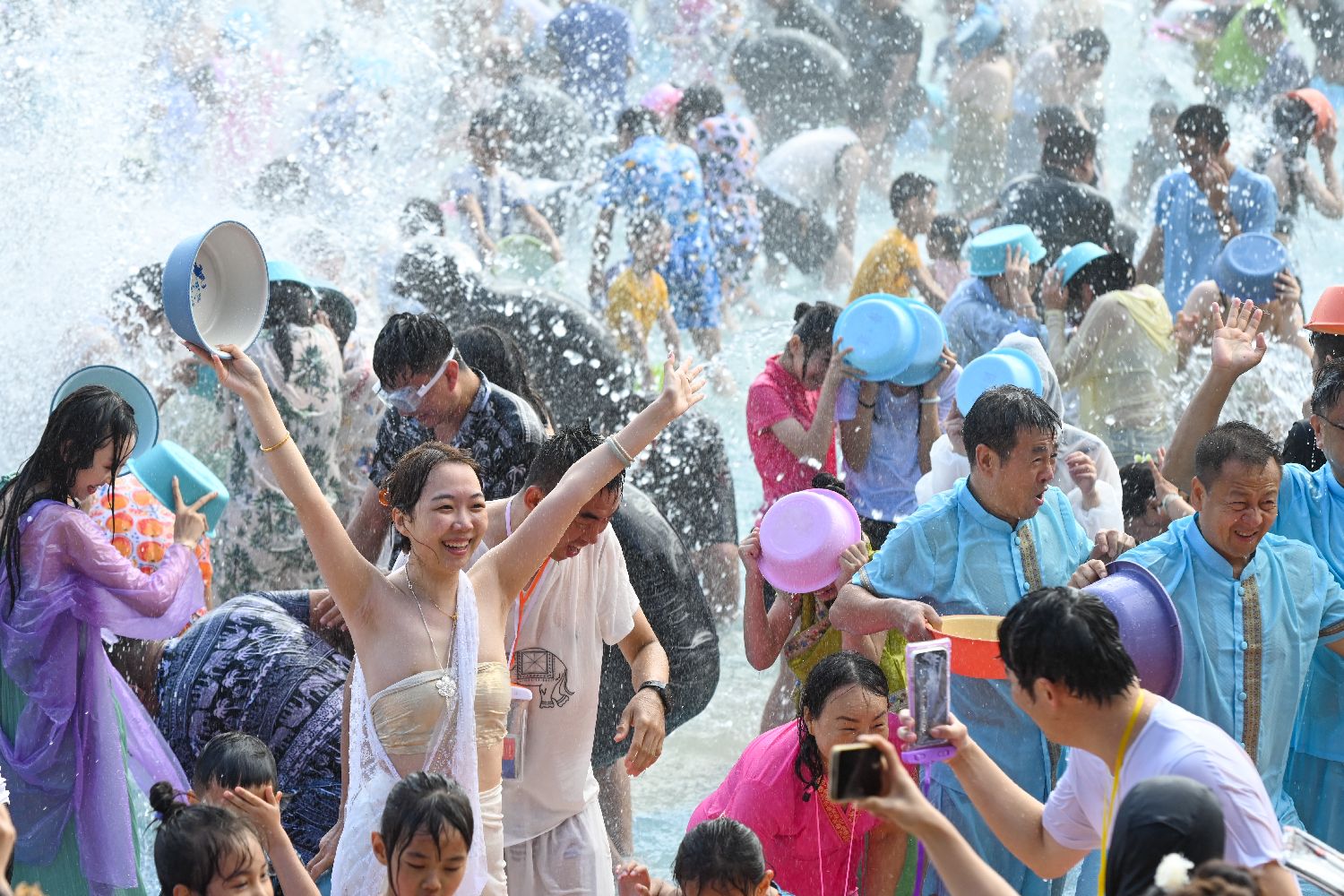 众多游客10月2日到云南省西双版纳傣族自治州橄榄坝的西双版纳傣族园景区,体验傣族泼水节,欢度中国国庆假期。(图片来源:中新社)