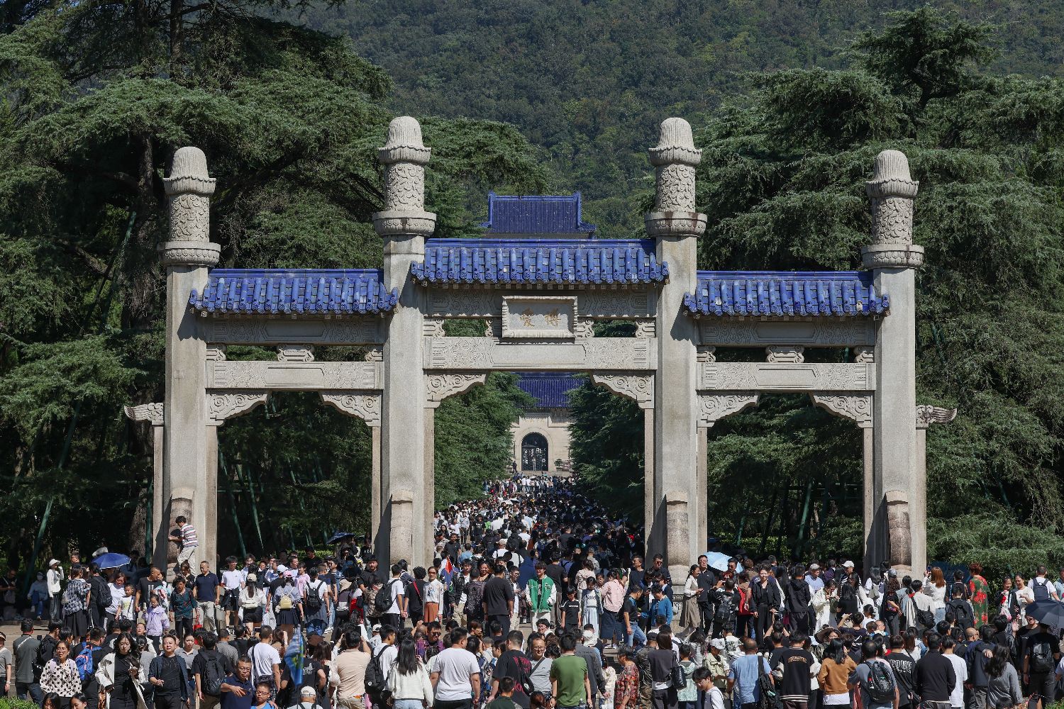 10月2日,游客们在江苏南京中山陵参观。(图片来源:中新社)