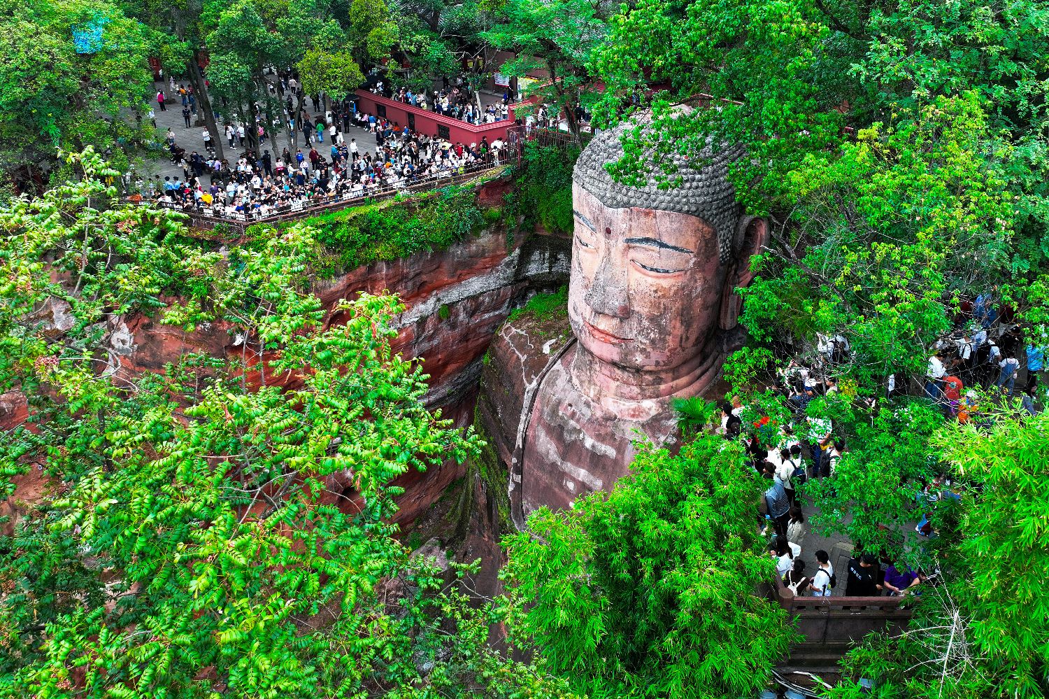 10月2日,四川省乐山大佛景区迎来中国国庆客流高峰,游山票和船票早早售罄,景区内游人如织。图为观景平台上聚集了不少游客一睹大佛真容。(无人机照片)(图片来源:中新社)