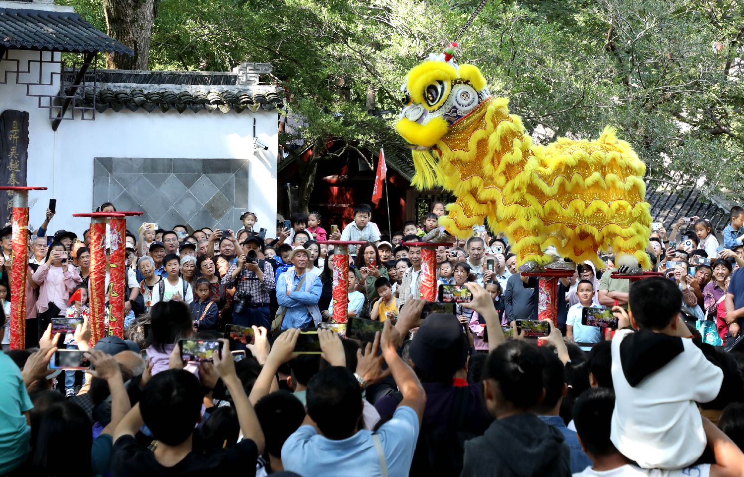游客10月2日在江苏省苏州市虎丘山景区观赏舞狮民俗表演。(图片来源:新华社)