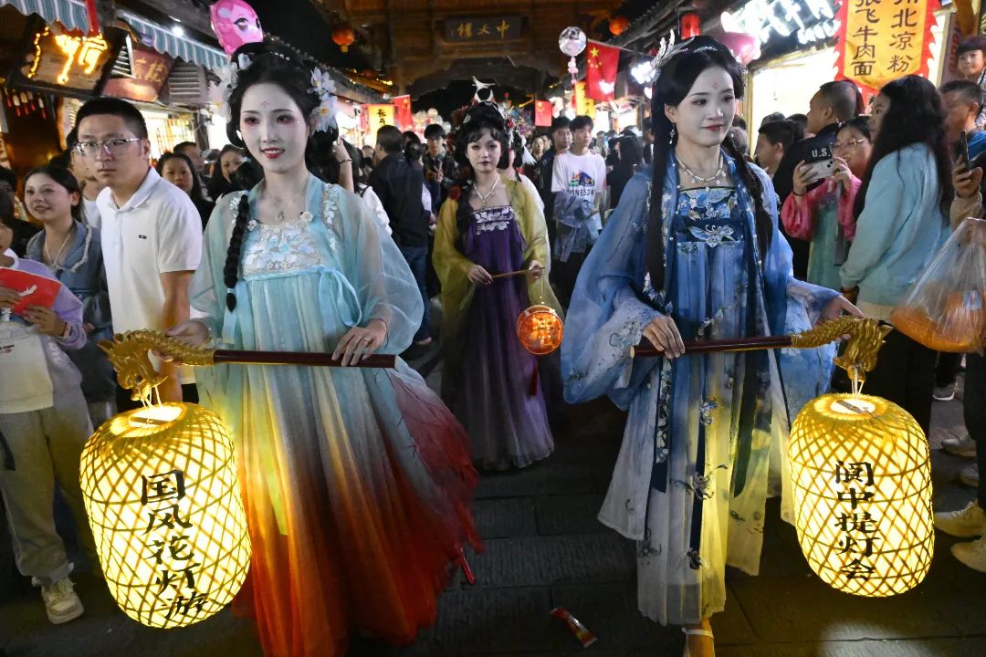 10月3日,在灯火阑珊的四川省南充阆中古城街道上,月下鱼灯,提灯游,汉服穿搭秀精彩纷呈,汉服小姐姐们身着华丽的汉服走在古城街道上。(图片来源:南充文旅微信公众号)