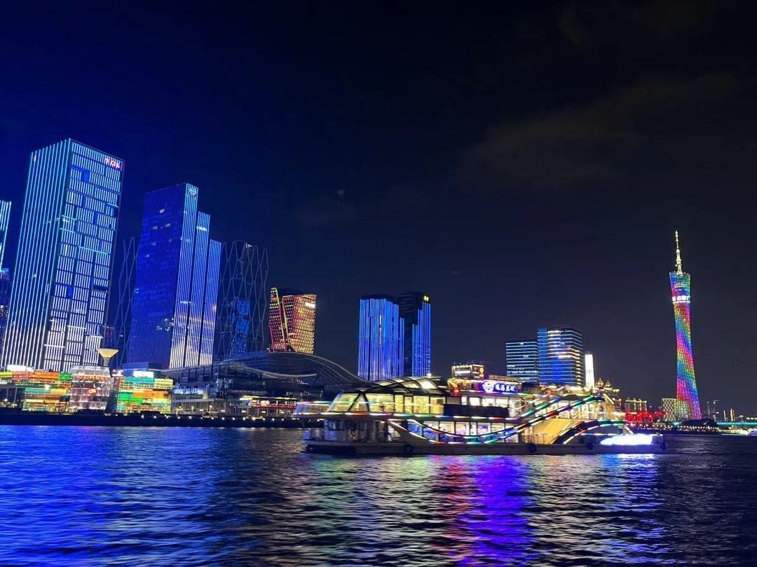 广州推出多个主题航班和与市内周边景点的联游套餐,“汉服游”“国乐会”“非遗体验”等多个沉浸式夜游主题航班受到旅客青睐。旅客可以穿着汉服与簪花仕女同乘游船,同逛市集,同做手工,同赏美景,来一场沉浸式的出游体验。图为夜游船舶行驶珠江之上。(图片来源:广州大洋网)