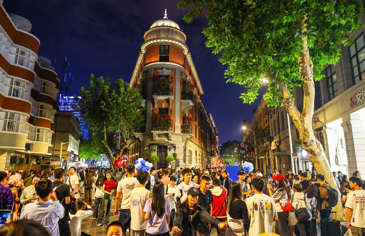 10月3日,不少在武汉旅游的游客热衷夜晚出行,感受武汉火热的夜经济。图为在巴公房子前,市民、游客众多。(图片来源:中新社)