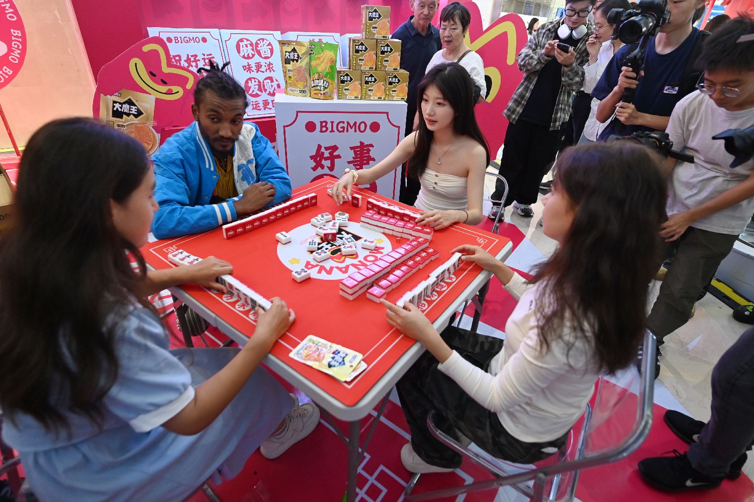 10月3日,湖南长沙迎客流高峰,大街小巷游人如织。不少游客热衷夜晚出行,感受长沙火热的夜经济。图为中外游客在长沙街头切磋麻将引围观。(图片来源:中新社)
