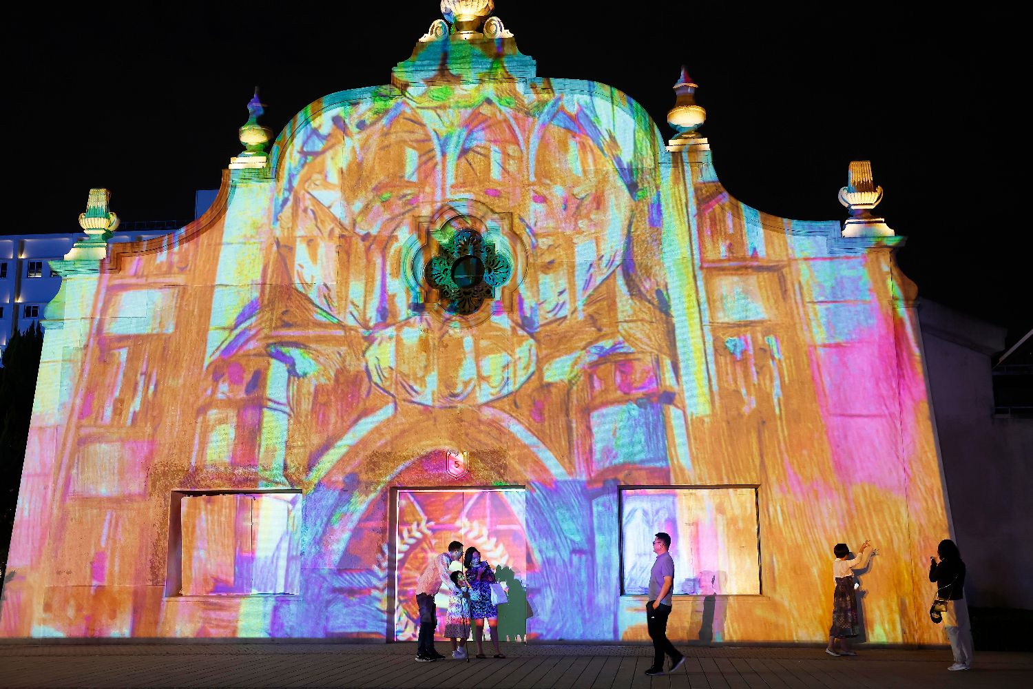 民众10月2日在位于上海市长宁区的上生·新所欣赏光影秀。近日,上海举办首届国际光影节,通过光影艺术激发城市活力与创新。(图片来源:中新社)