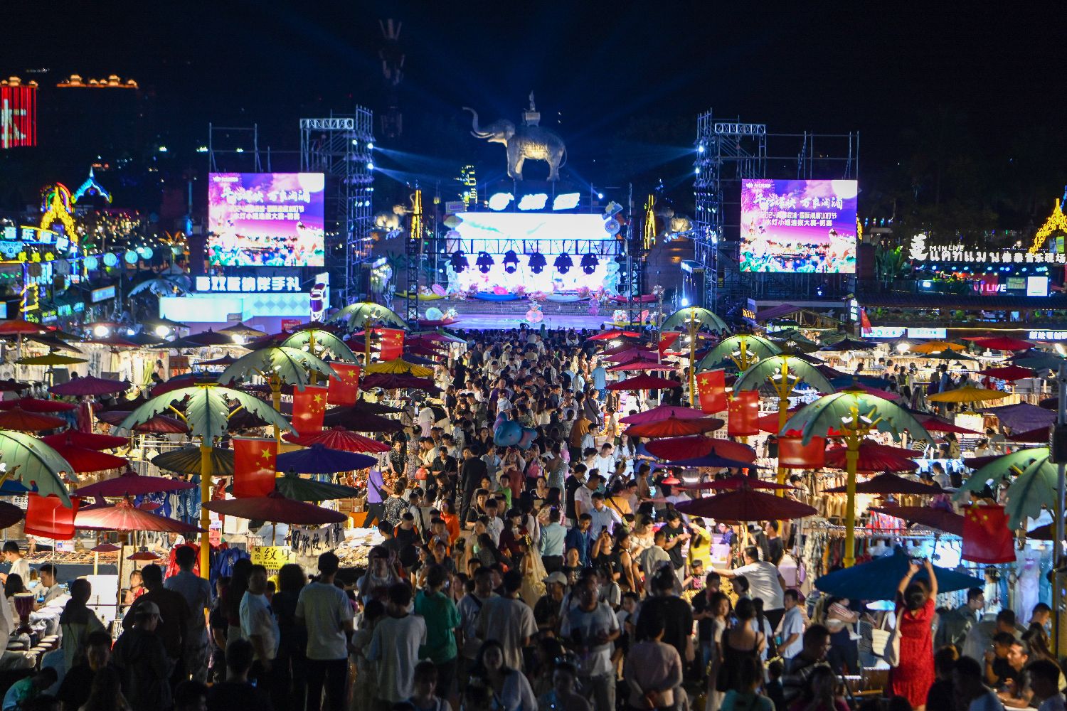 10月2日,云南省西双版纳傣族自治州景洪市告庄西双景星光夜市人气旺,各地游客旅游度假,感受民族风情。(图片来源:中新社)