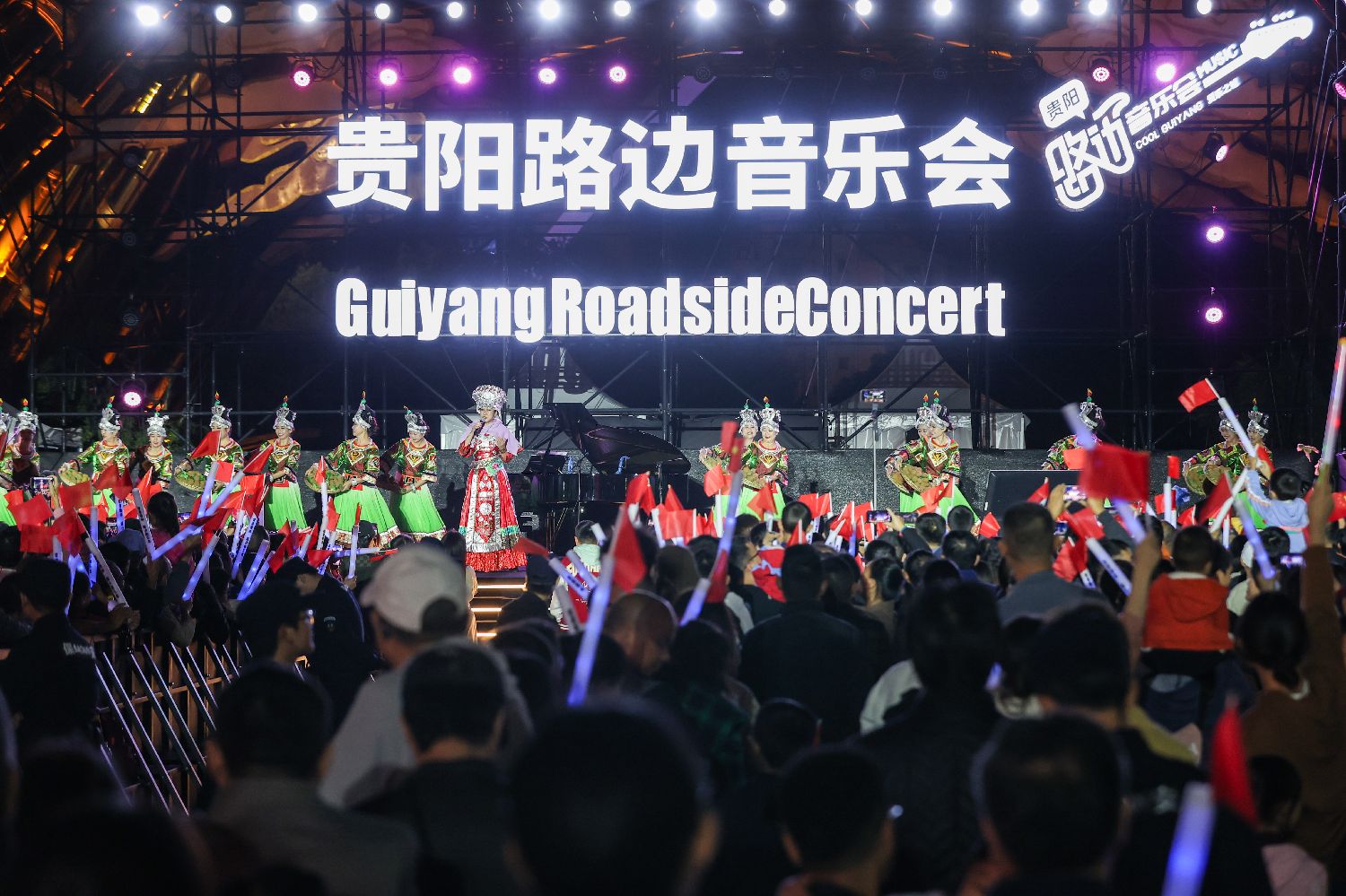 10月2日晚,贵州省贵阳市南明区甲秀楼景区、青云市集、筑城广场的夜游、夜购、夜演(路边音乐会)项目人气旺盛,吸引众多游客选择夜间出游、消费,度过假期。图为筑城广场“贵阳路边音乐会”吸引游客。(图片来源:中新社)