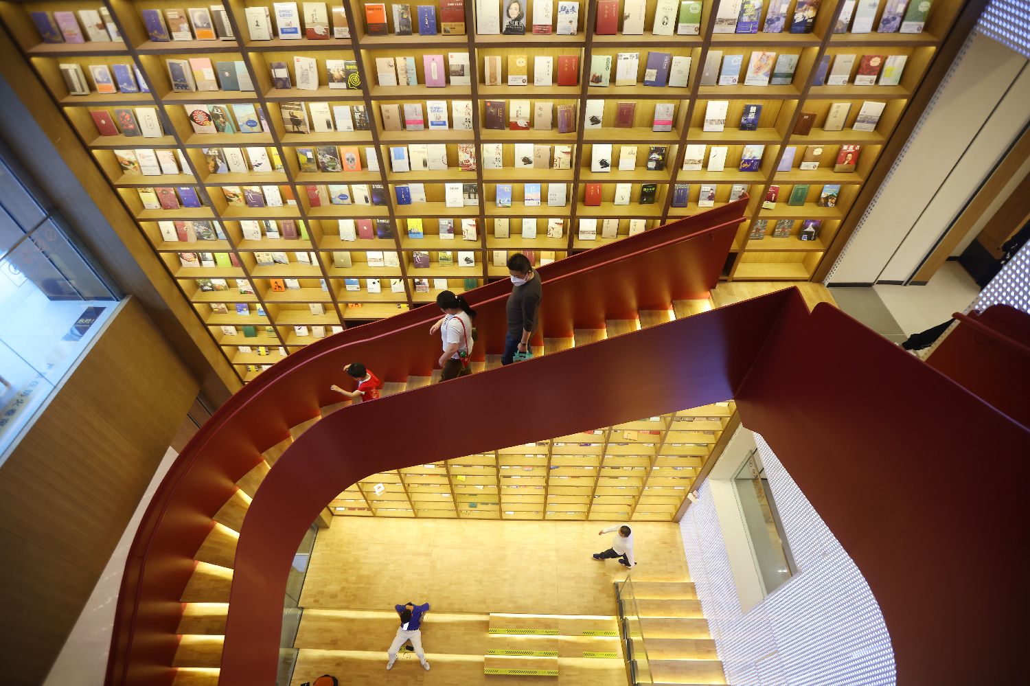 在江苏南京,设计新颖的锦创书城以创意楼梯、各式风格的阅读区以及琳琅满目的书籍,吸引民众阅读,成为当地“网红打卡点”。图为读者从大型书架前的楼梯上走过(2022年4月22日摄)。(图片来源:中新社)