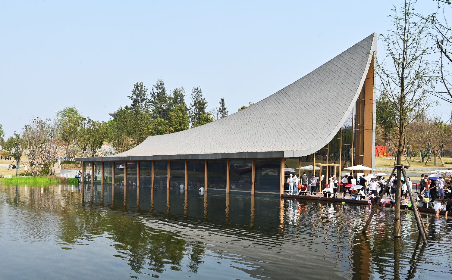 在四川成都,中信书店成都兴隆湖店因店内地面位于玻璃墙外的水面以下而被称为“水下书店”。书店位于兴隆湖旁西南侧,毗邻天府新区规划厅,独特的建筑设计吸引不少当地民众前往参观。图为“水下书店”外景(3月13日摄)。(图片来源:中新社)
