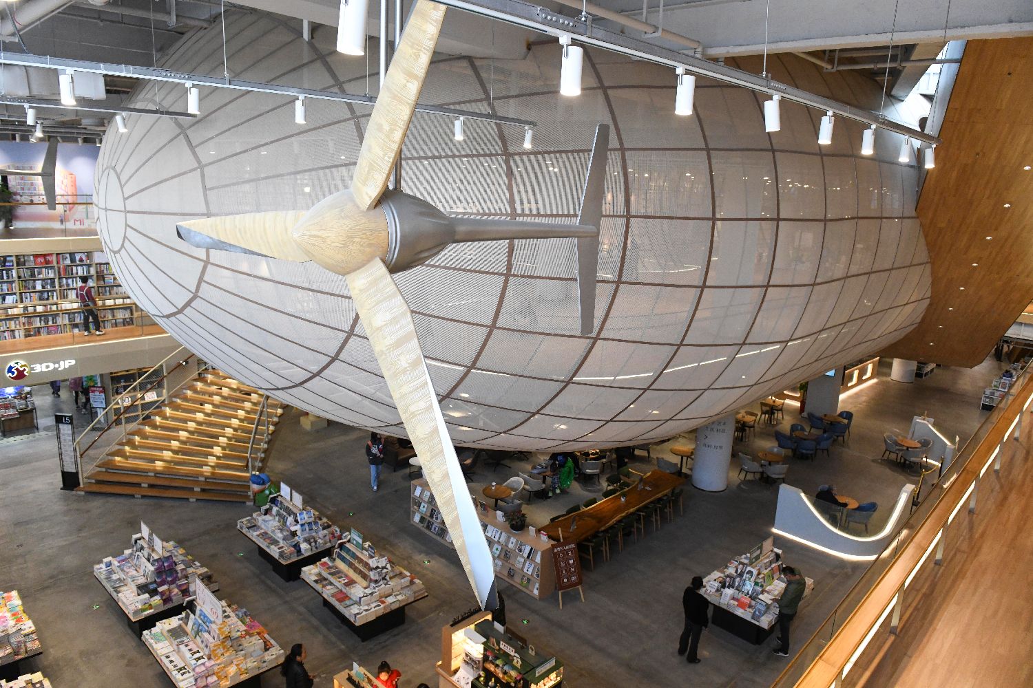在湖南长沙,“巨型飞艇”悬浮在书店上空(2021年12月22日摄)。当日,湖南长沙一书店内的飞艇造型装饰,吸引了众多市民打卡,市民在“飞艇”上品读图书,仿佛在空中遨游。(图片来源:中新社)