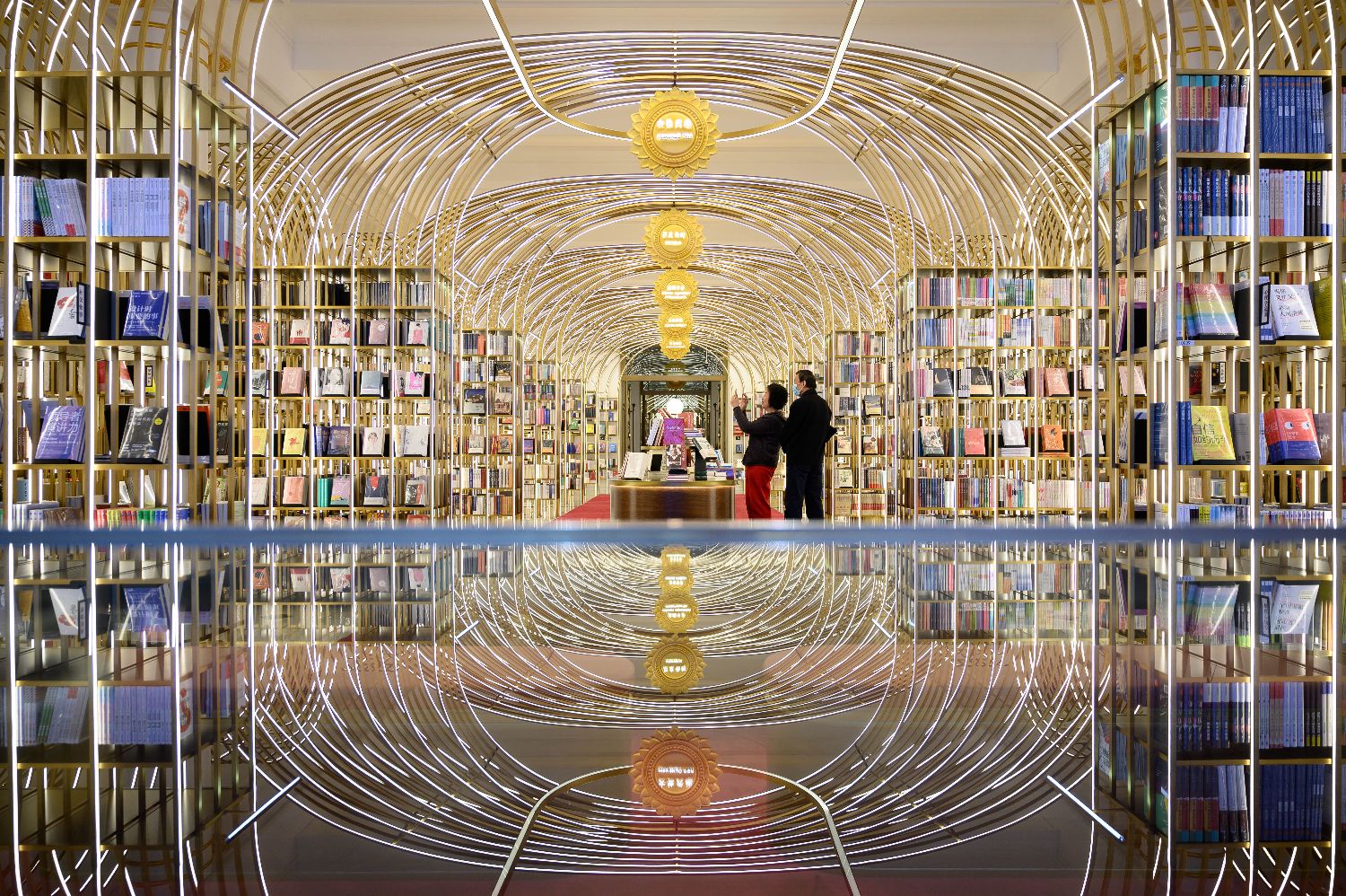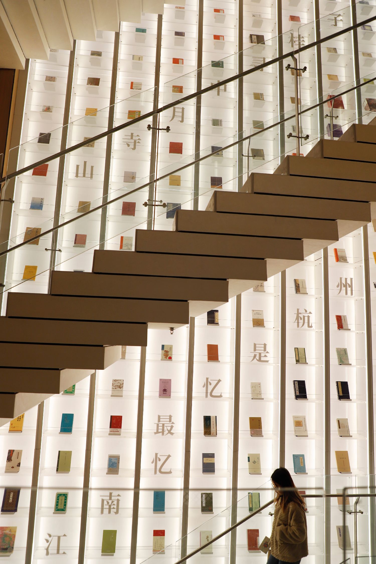 近日,经过410天的闭店升级,70年历史的杭州解放路新华书店正式回归。改造后的书店营业面积总计3800平方米,汇集5万种图书。图为市民经过浙江杭州解放路新华书店内“诗词天阶”串联的空间(1月17日摄)。(图片来源:中新社)