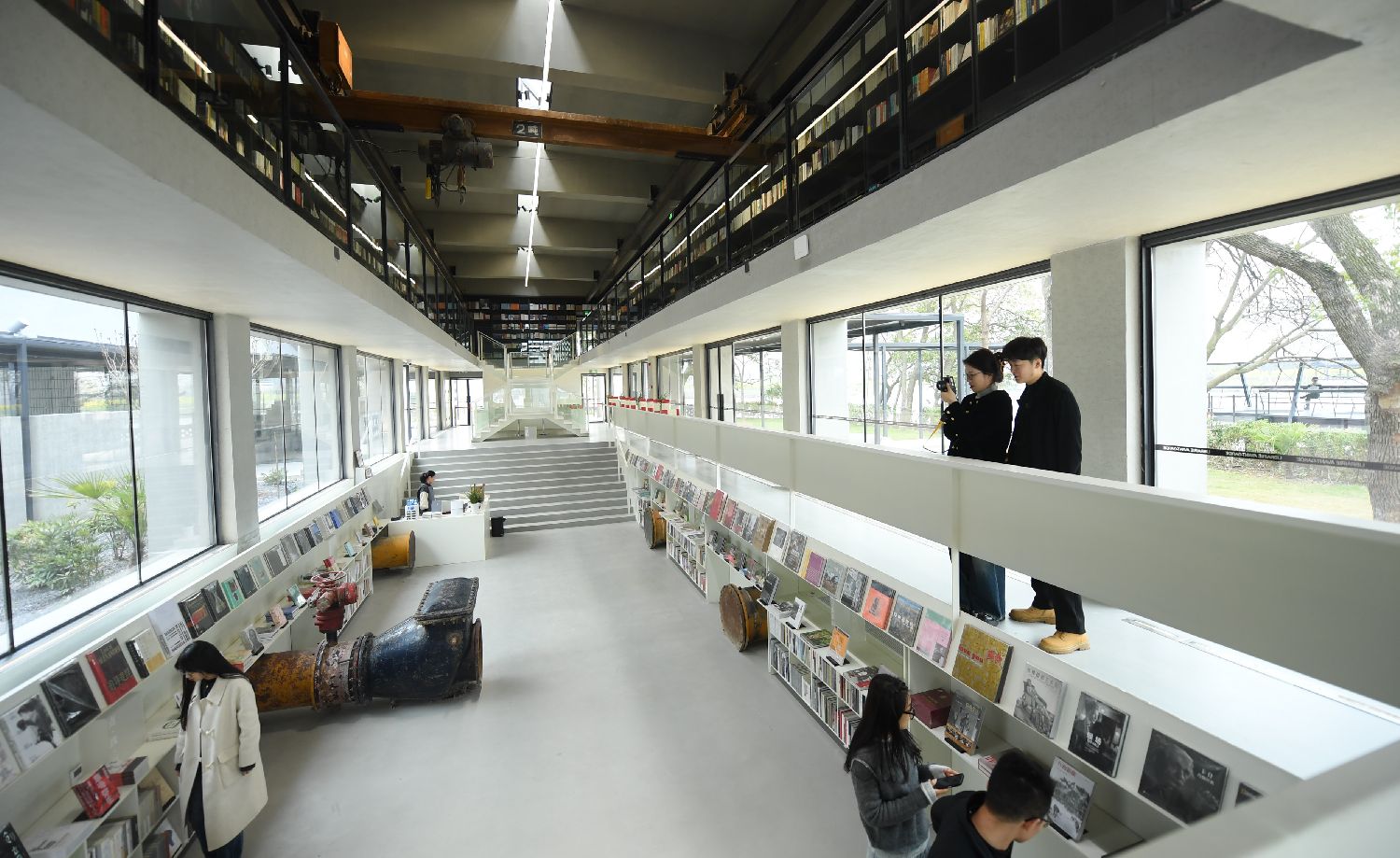 游客在由自来水厂改造的先锋鉴湖书店参观(3月15日摄)。浙江省绍兴市柯桥区柯岩街道叶家堰居地处鉴湖畔,近年来通过挖掘“酒源特色、鉴湖风貌”,转变为浙江省金3A级景区村庄(图片来源:新华社)