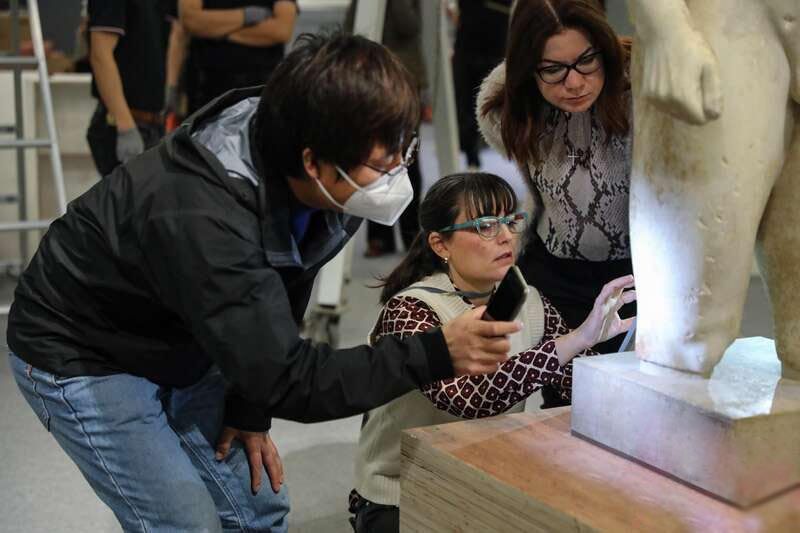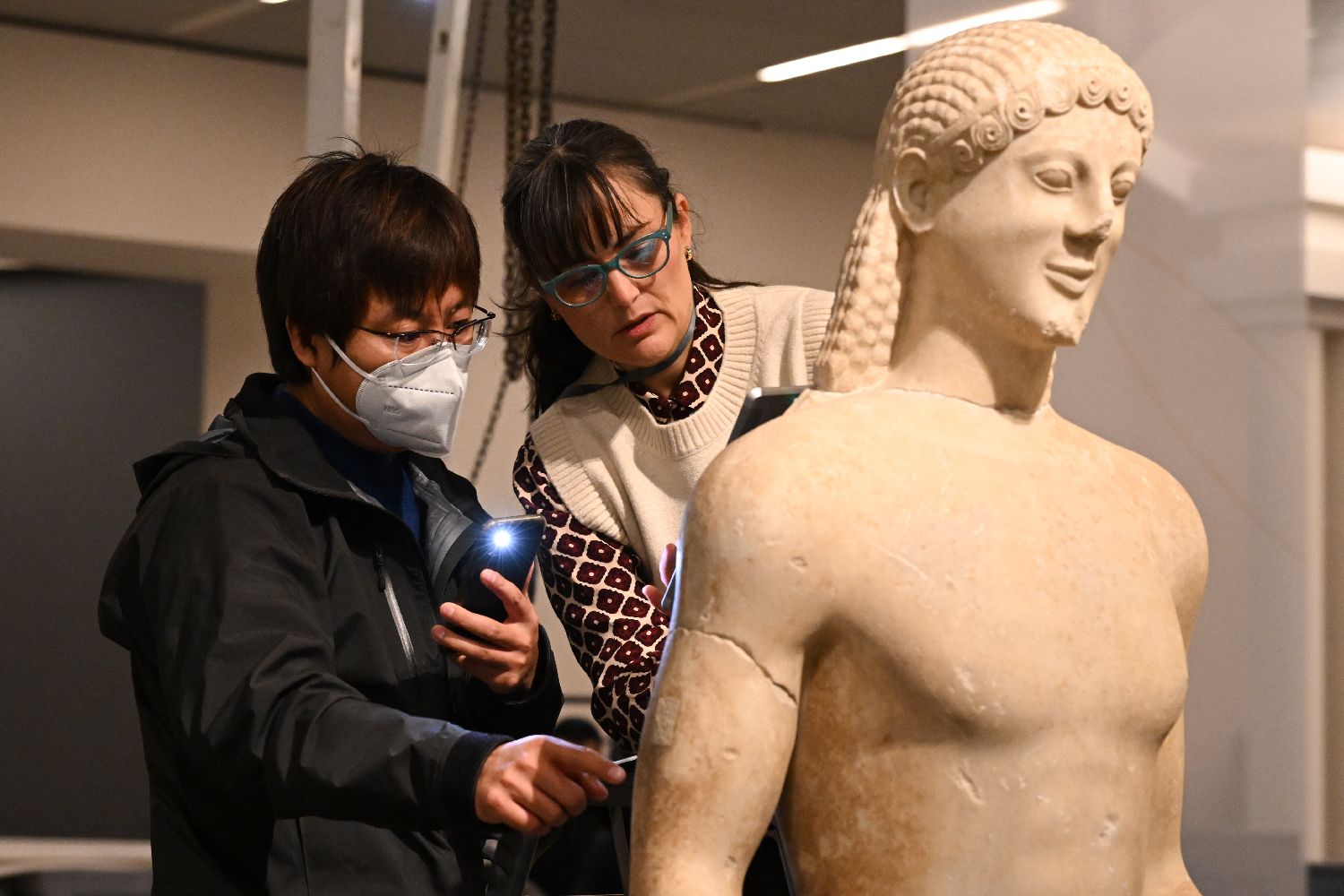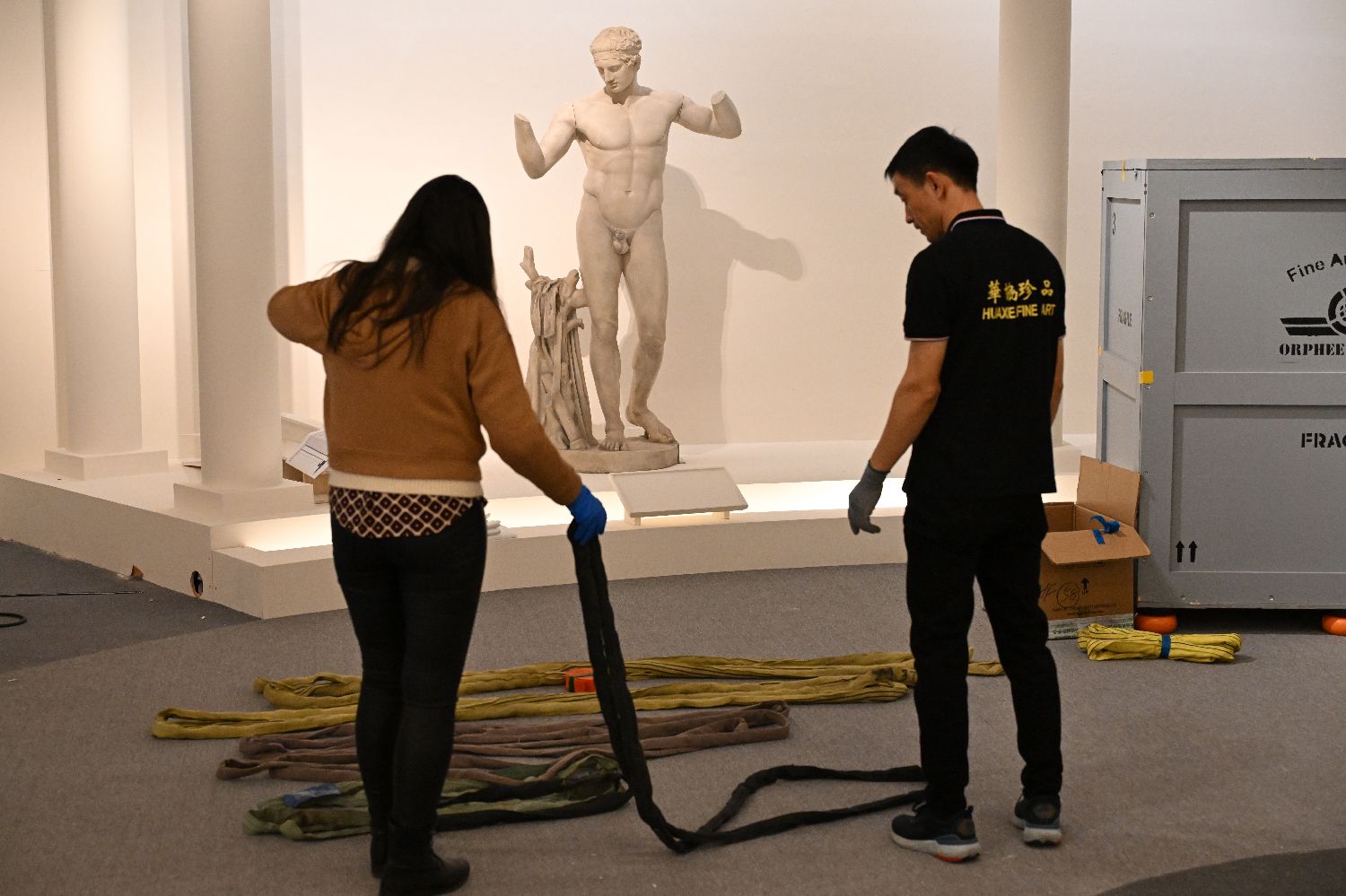 阿佛洛狄忒雕像等绝大部分展品为首次在希腊境外亮相。图为21日,工作人员在中国国博点交即将展出的大理石库罗斯(阿波罗或男青年)雕像。(图片来源:中新社)