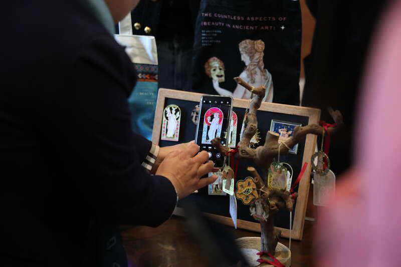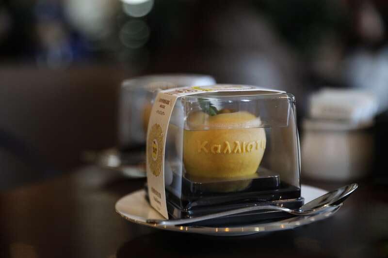 印有古希腊字母的金苹果形状慕斯蛋糕。据了解,本次展览衍生开发了众多种类的希腊艺术风格文创和餐饮产品,比如毛绒玩偶、香薰、首饰、冰箱贴等多种女神主题系列文创产品,还有拉花咖啡、慕斯蛋糕、曲奇饼干等美食饮品。(图片来源:北京《中国青年报》)