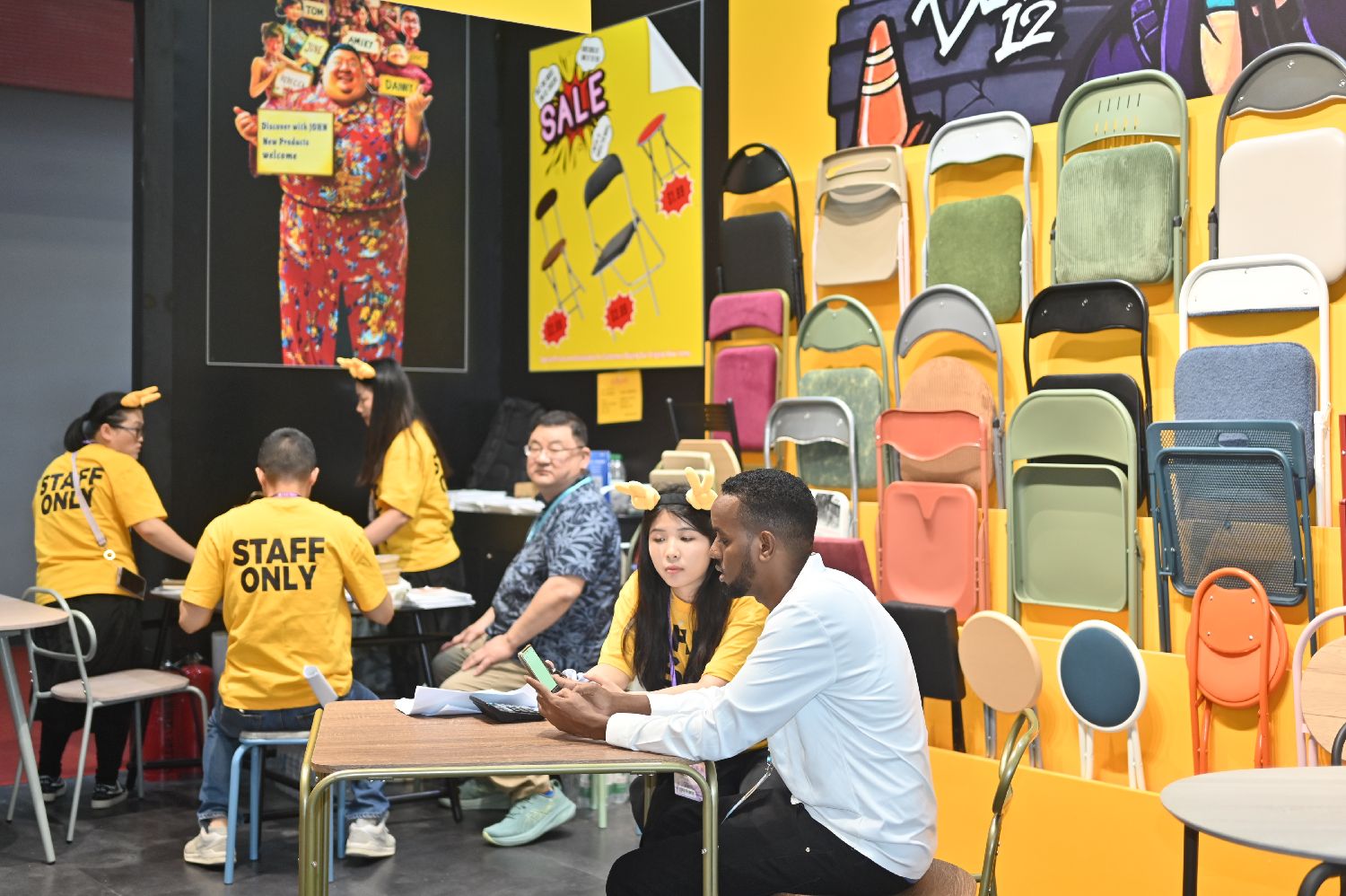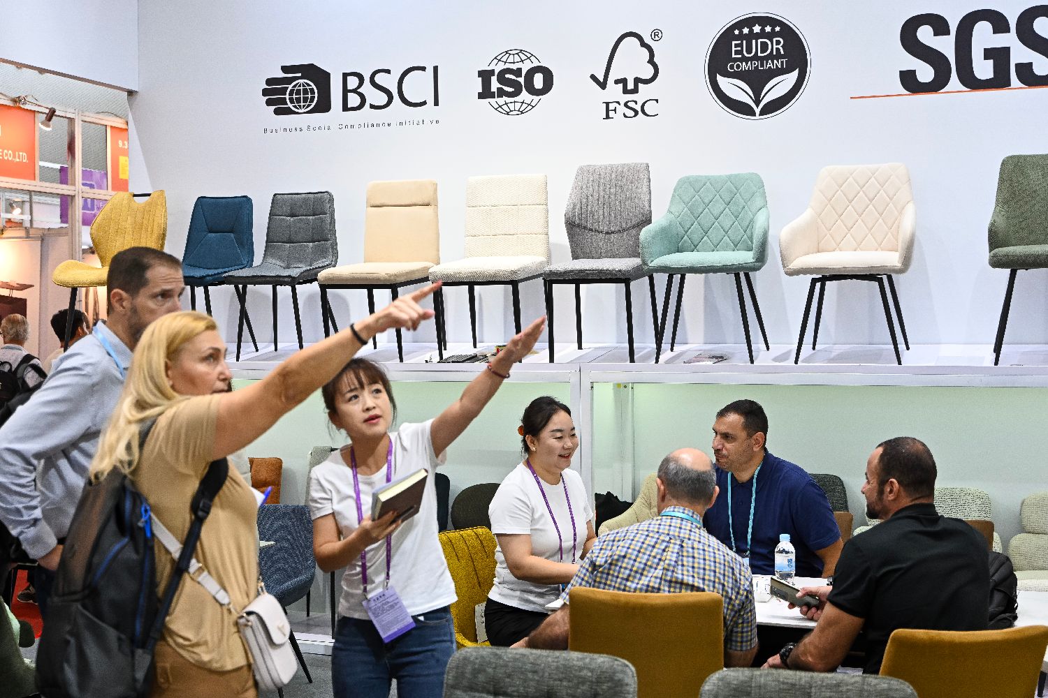 23日,一桌椅展位吸引采购商咨询洽谈。(图片来源:中新社)