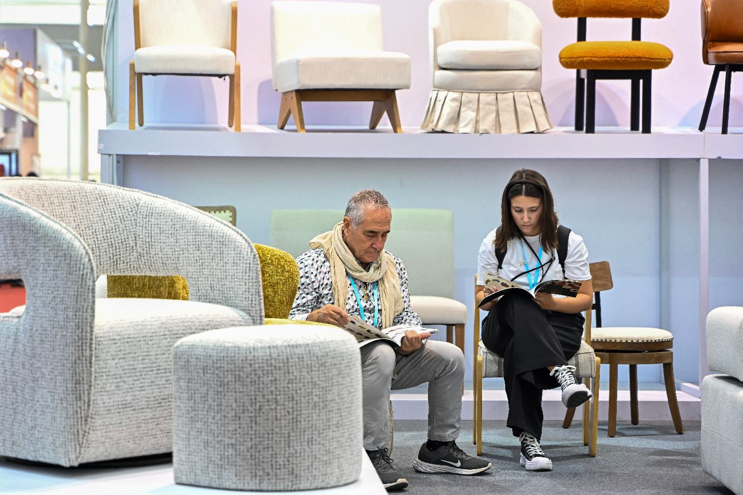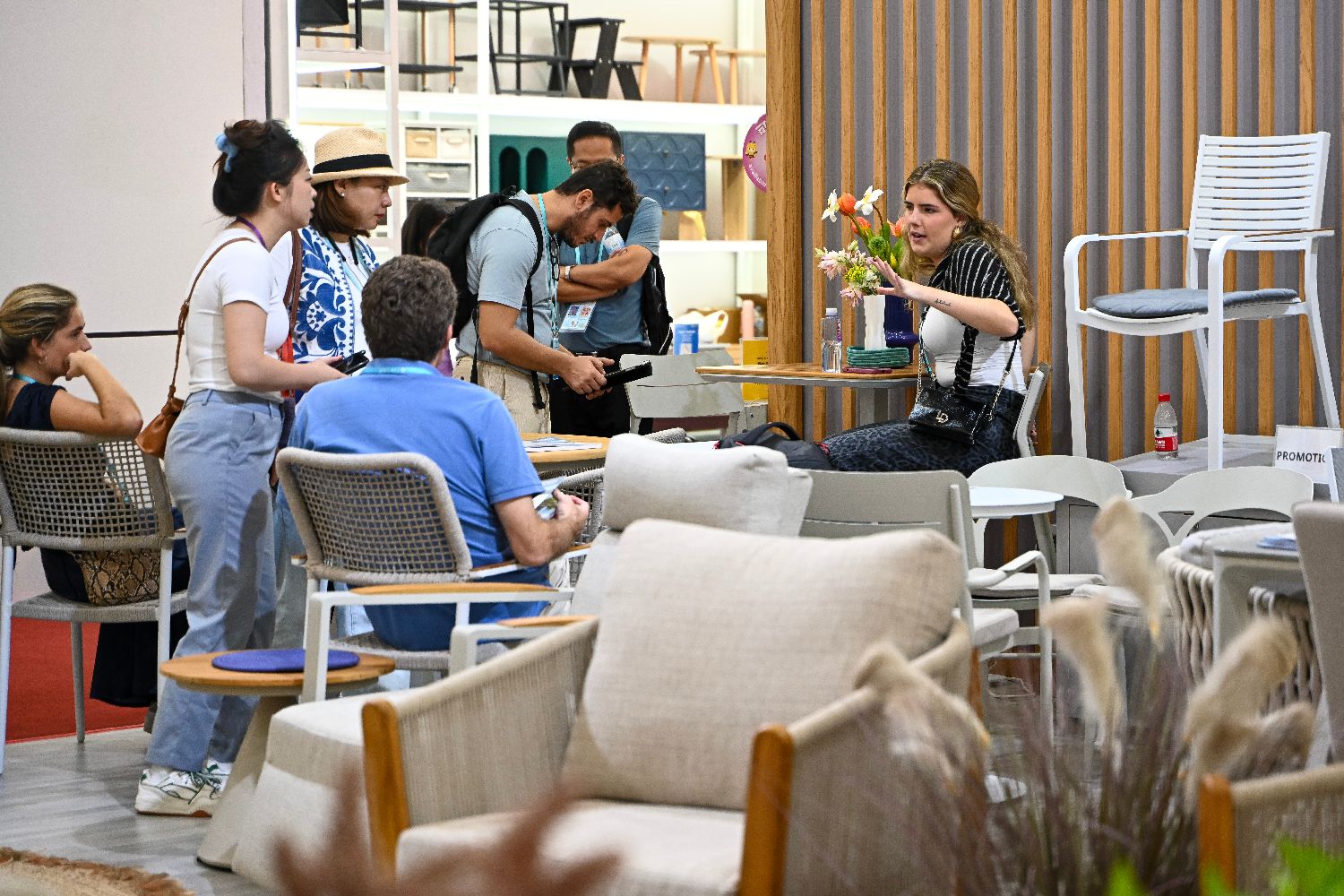 参展商与采购商23日在室内家具展区内洽谈。(图片来源:中新社)