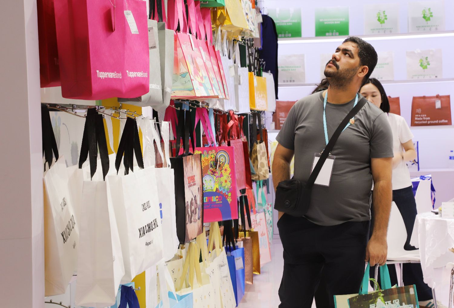 采购商挑选以PET塑料瓶为原料制成的环保购物袋。(图片来源:北京人民网)