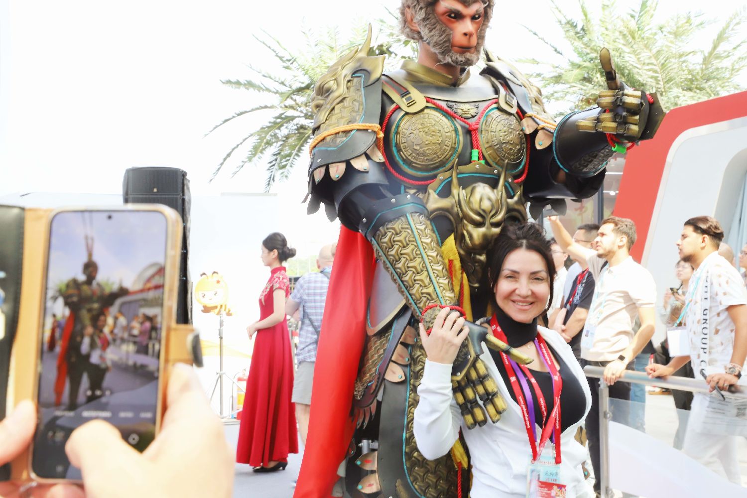 “大圣”亮相广交会,各国客商争相合影留念。(图片来源:北京人民网)