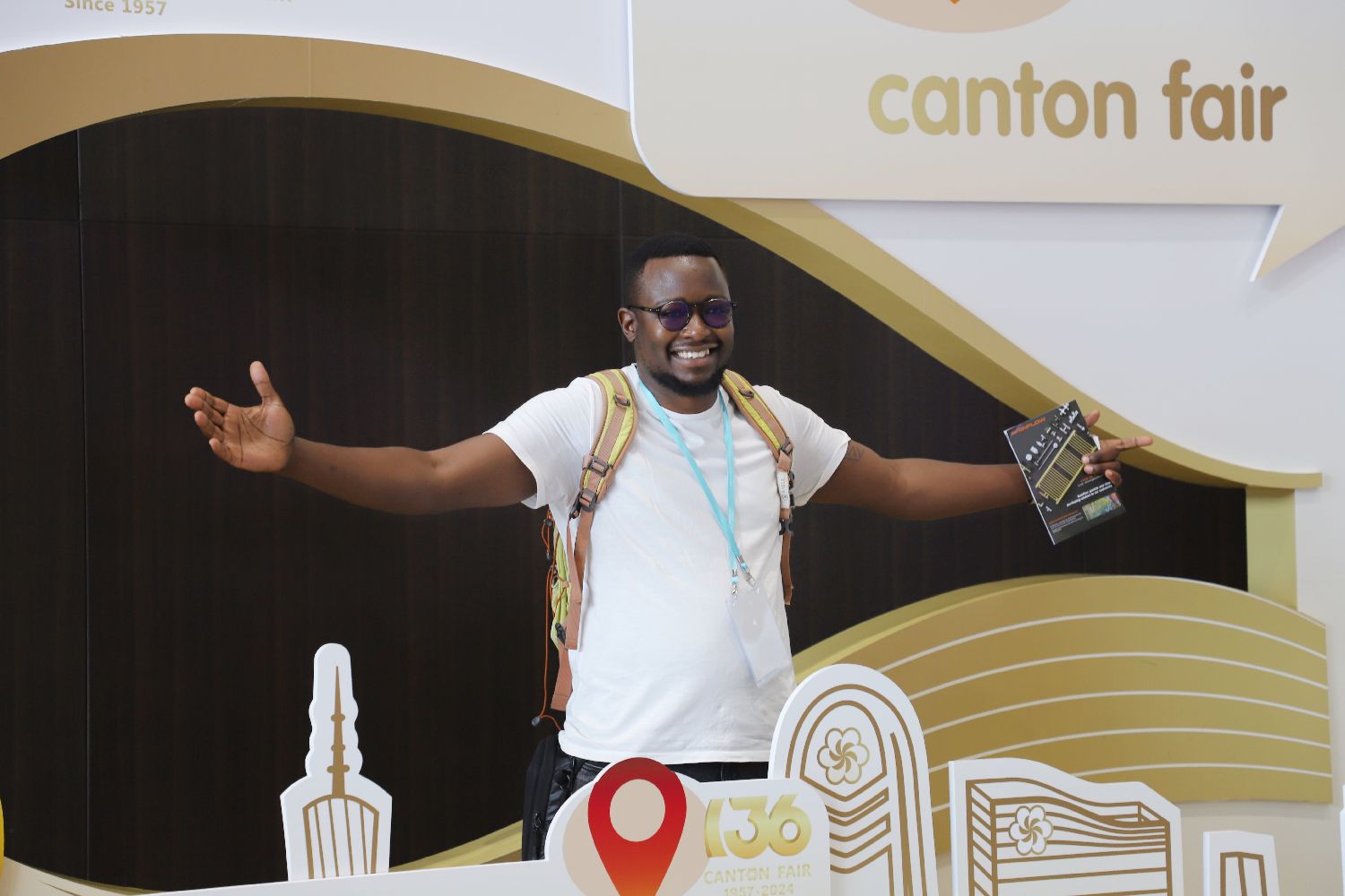 各国客商与广交会标志立牌合影留念。(图片来源:北京人民网)