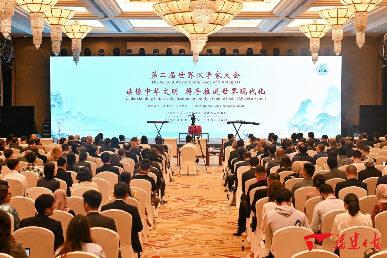 以“读懂中华文明,携手促进世界现代化”为主题的第二届世界汉学家大会27日在南平市开幕。图为开幕现场。(图片来源:《福建日报》)