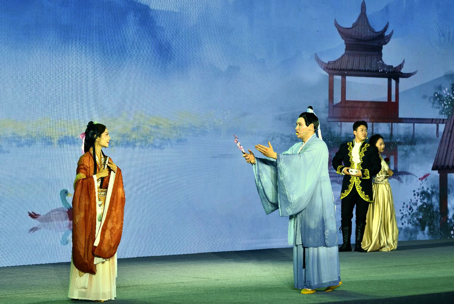 表演者在开幕式“融通中外文明的使者”主题展示上表演节目《经典永流传——东方的罗密欧朱丽叶和西方的梁山伯祝英台》。(图片来源:中新社)