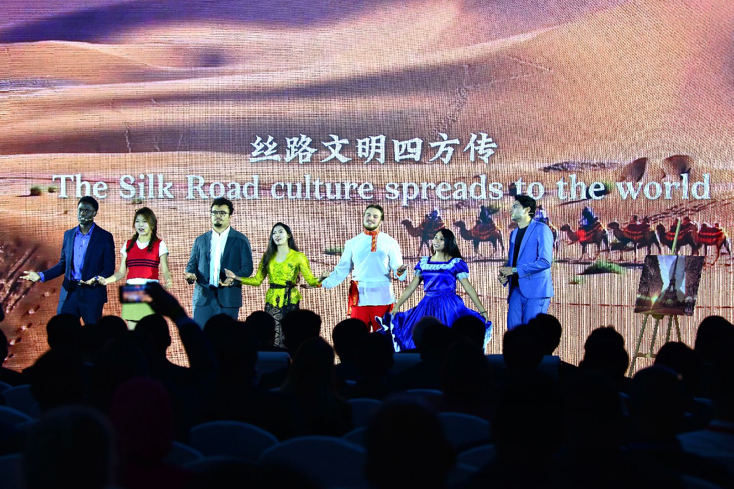 表演者在开幕式“融通中外文明的使者”主题展示上表演节目《丝路联通世界文明汉学汇聚青年力量》。(图片来源:中新社)